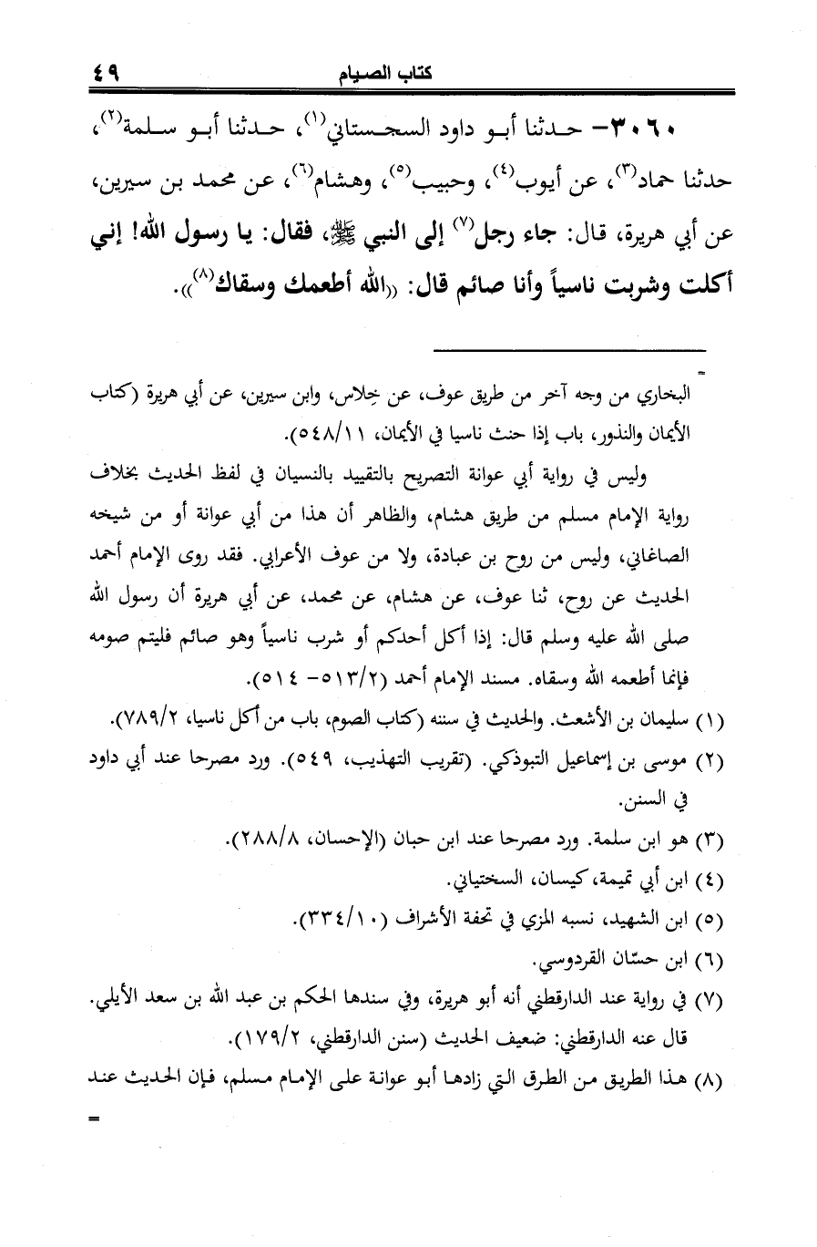 3060 - حدثنا أبو داود السجستاني (¬1)، حدثنا أبو سلمة (¬2)، حدثنا حماد (¬3)، عن أيوب (¬4)، وحبيب (¬5)، وهشام (¬6)، عن محمد بن سيرين، عن أبي هريرة، قال: جاء رجل (¬7) إلى النبي -صلى الله عليه وسلم-، فقال: يا رسول الله! إني أكلت وشربت ناسيًا وأنا صائم قال: "الله أطعمك وسقاك (¬8) ".