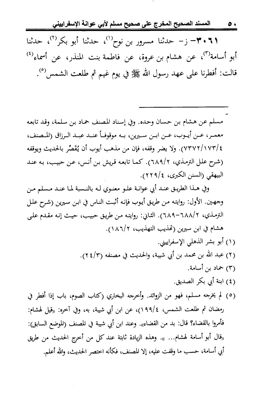 3061 - ز- حدثنا مسرور بن نوح (¬1)، حدثنا أبو بكر (¬2)، حدثنا أبو أسامة (¬3)، عن هشام بن عروة، عن فاطمة بنت المنذر، عن أسماء (¬4) قالت: أفطرنا على عهد رسول الله -صلى الله عليه وسلم- في يوم غيم ثم طلعت الشمس (¬5).