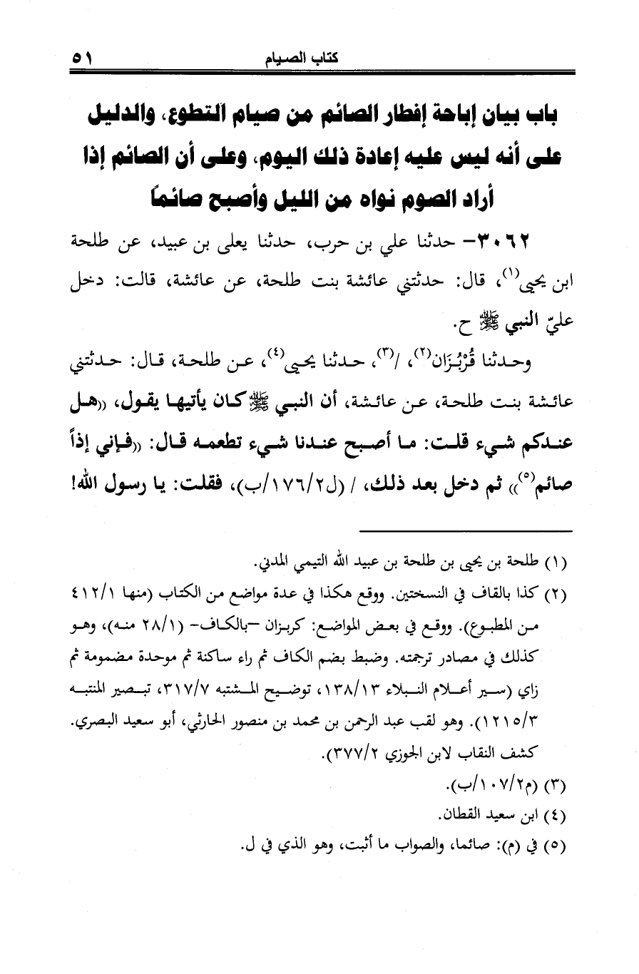 (¬9) رواه مسلم (كتاب الصيام، باب جواز صوم النافلة بنية من النهار قبل الزوال، وجواز فطر الصائم نفلا من غير عذر، 2/ 808)، عن أبي كامل، فضيل بن حسين، عن عبد الواحد بن زياد. وعن أبي بكر بن أبي شيبة، عن وكيع، كلاهما عن طلحة بنحوه.