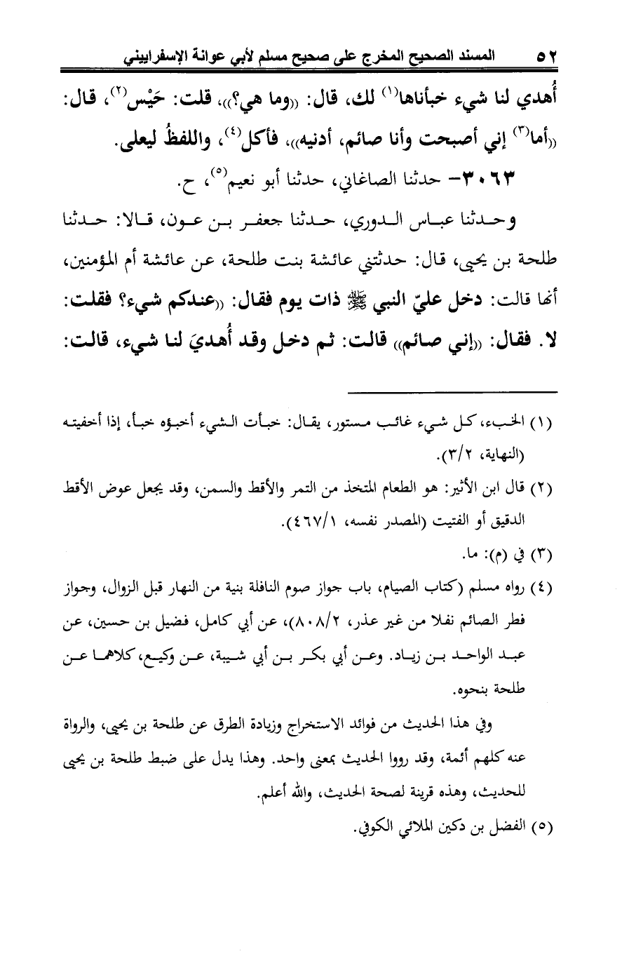 وحدثنا عباس الدوري، حدثنا جعفر بن عون، قالا: حدثنا طلحة بن يحيى، قال: حدثتني عائشة بنت طلحة، عن عائشة أم المؤمنين، أنها قالت: دخل عليّ النبي -صلى الله عليه وسلم- ذات يوم فقال: "عندكم شيء؟ فقلت: لا. فقال: "إني صائم" قالت: ثم دخل وقد أُهديَ لنا شيء، قالت: