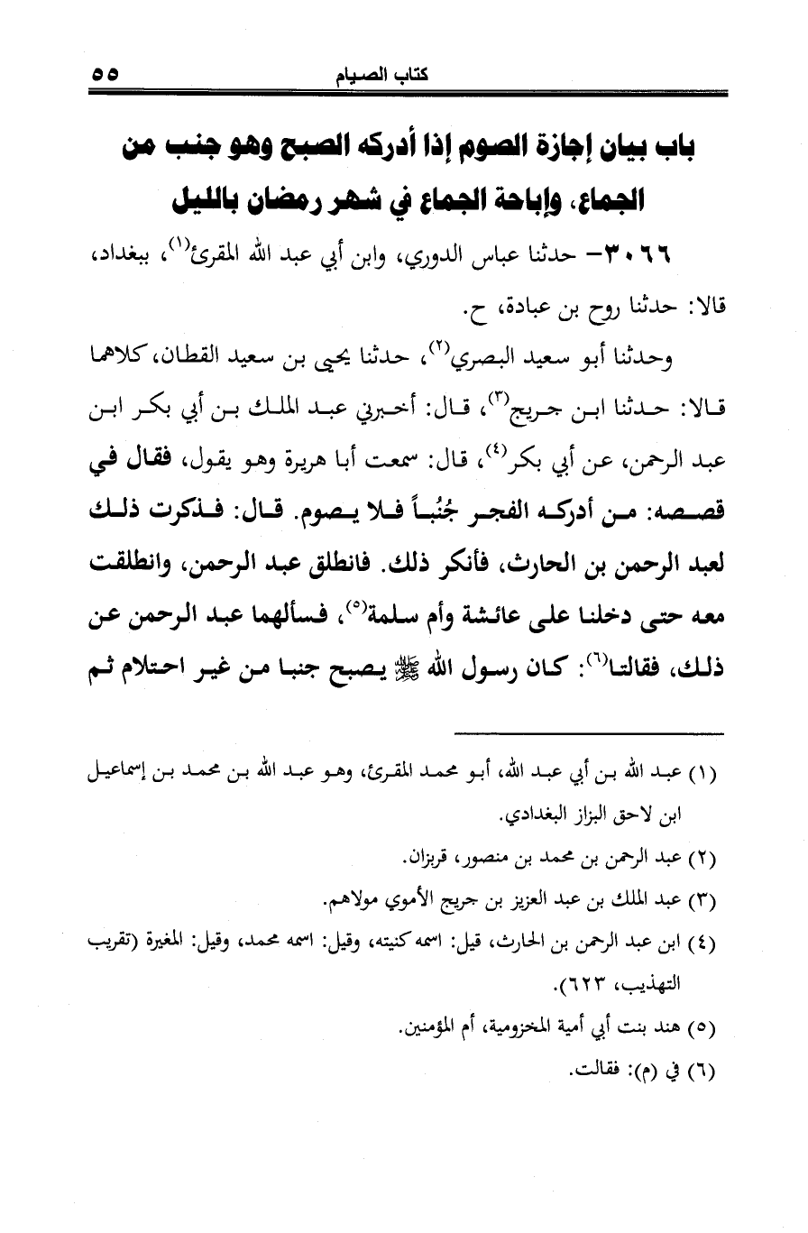 وحدثنا أبو سعيد البصري (¬2)، حدثنا يحيى بن سعيد القطان، كلاهما قالا: حدثنا ابن جريج (¬3)، قال: أخبرني عبد الملك بن أبي بكر ابن عبد الرحمن، عن أبي بكر (¬4)، قال: سمعت أبا هريرة وهو يقول، فقال في قصصه: من أدركه الفجر جُنُبًا فلا يصوم. قال: فذكرت ذلك لعبد الرحمن بن الحارث، فأنكر ذلك. فانطلق عبد الرحمن، وانطلقت معه حتى دخلنا على عائشة وأم سلمة (¬5)، فسألهما عبد الرحمن عن ذلك، فقالتا (¬6): كان رسول الله -صلى الله عليه وسلم- يصبح جنبا من غير احتلام ثم