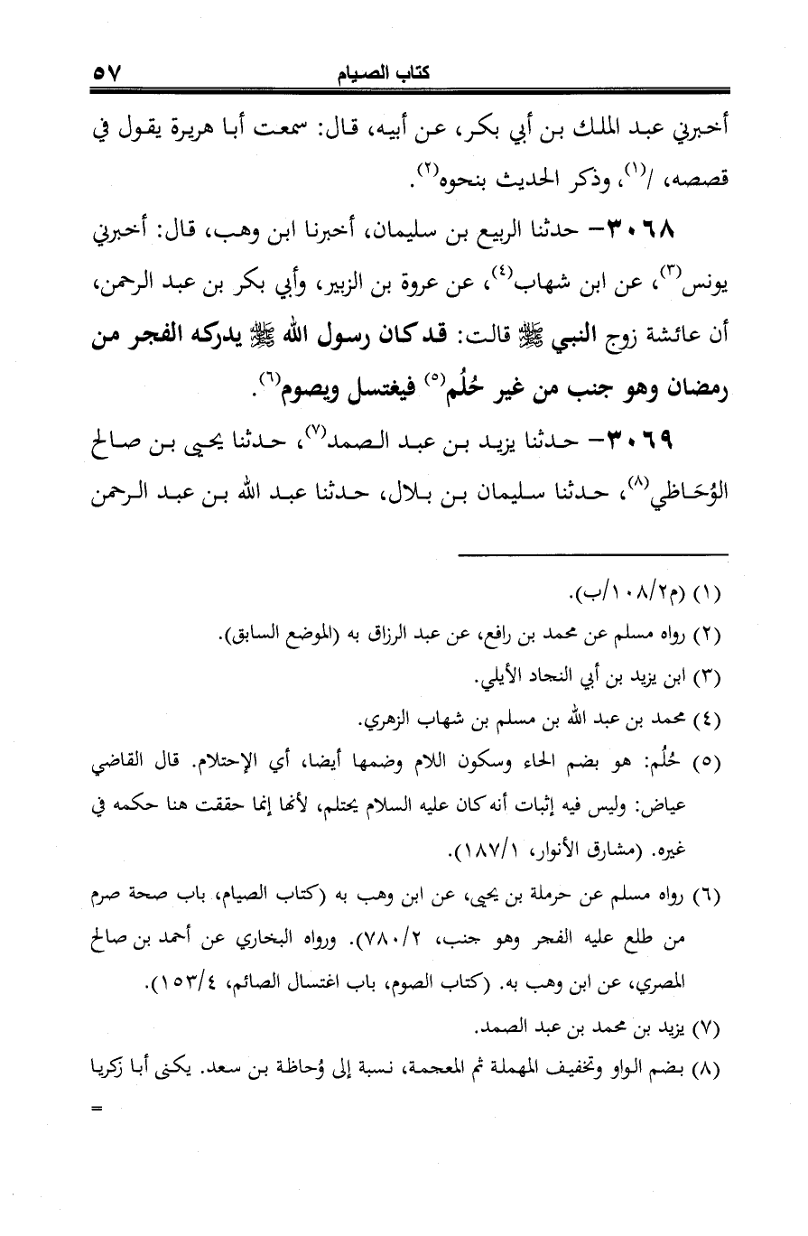 (¬4) رواه مسلم عن حرملة بن يحيى، عن ابن وهب به (كتاب الصيام، باب صحة صوم من طلع عليه الفجر وهو جنب، 2/ 780). ورواه البخاري عن أحمد بن صالح المصري، عن ابن وهب به. (كتاب الصوم، باب اغتسال الصائم، 4/ 153).