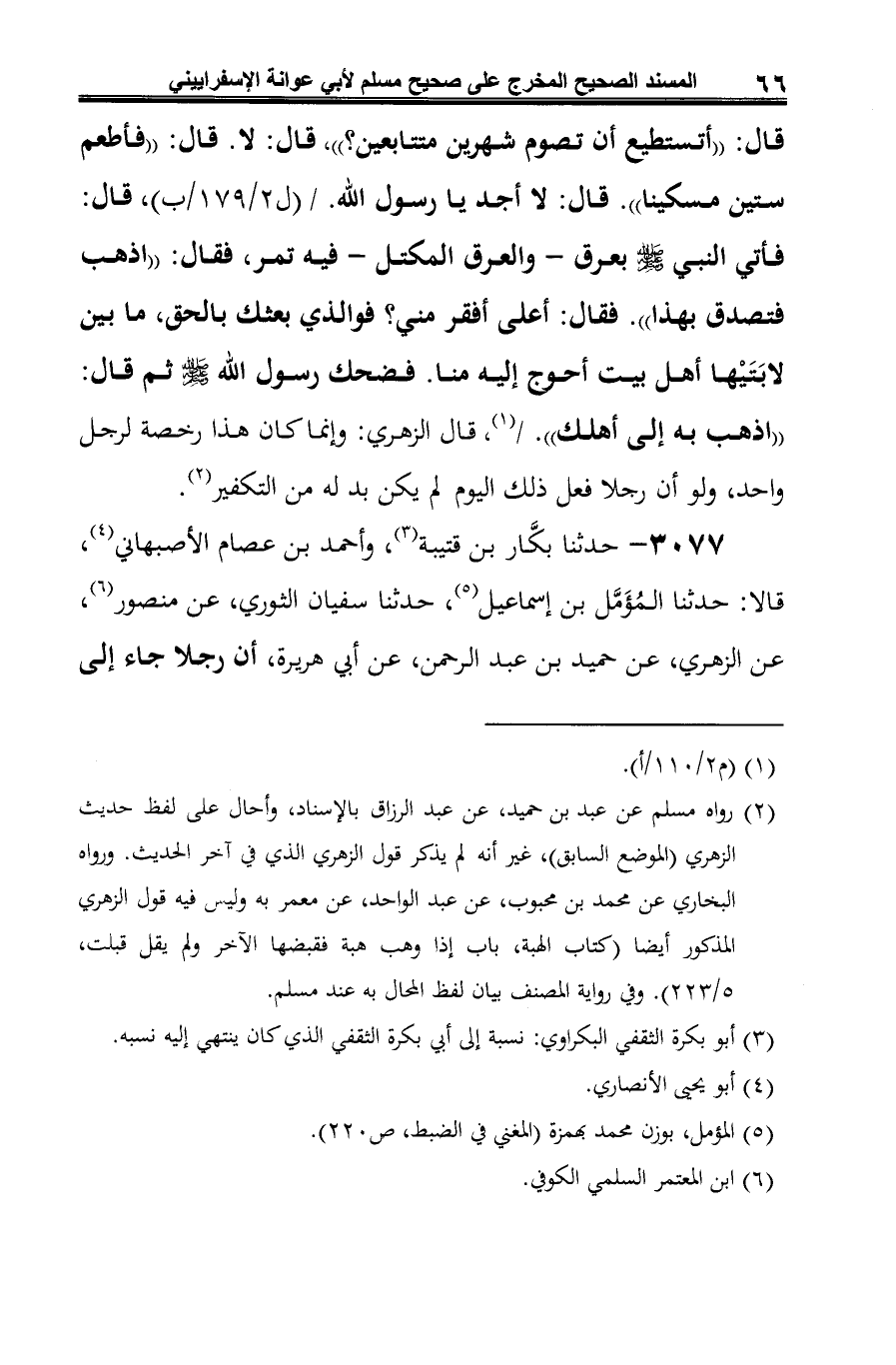 3077 - حدثنا بكَّار بن قتيبة (¬1)، وأحمد بن عصام الأصبهاني (¬2)، قالا: حدثنا المُؤَمَّل بن إسماعيل (¬3)، حدثنا سفيان الثوري، عن منصور (¬4)، عن الزهري، عن حميد بن عبد الرحمن، عن أبي هريرة، أن رجلا جاء إلى