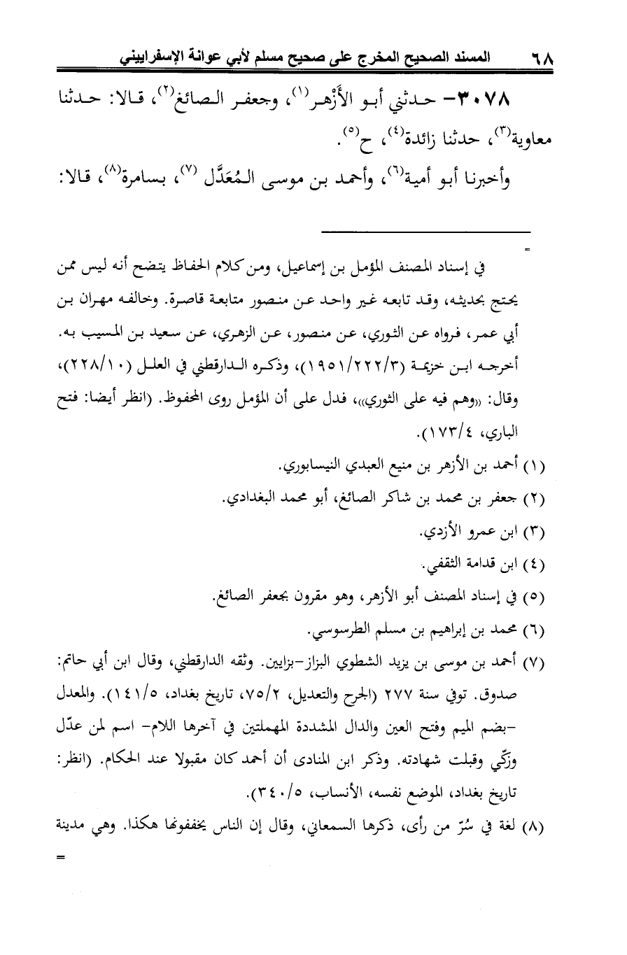 (¬13) زاد أبو عوانة على الإمام مسلم من طريق هذا الحديث، طريق إبراهيم بن سعد، عن الزهري (ح 75)، وطريق الثوري، وزائدة، وإبراهيم بن طهمان، كلهم عن منصور (ح 76، و 77). وهذا من فوائد الاستخراج.