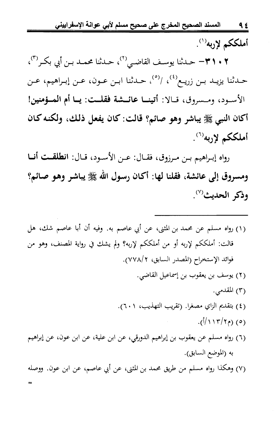 3102 - حدثنا يوسف القاضي (¬1)، حدثنا محمد بن أبي بكر (¬2)، حدثَنا يزيد بن زريع (¬3)، (¬4)، حدثنا ابن عون، عن إبراهيم، عن الأسود، ومسروق، قالا: أتينا عائشة فقلت: يا أم المؤمنين! أكان النبي -صلى الله عليه وسلم- يباشر وهو صائم؟ قالت: كان يفعل ذلك، ولكنه كان أملككم لإربه (¬5).
