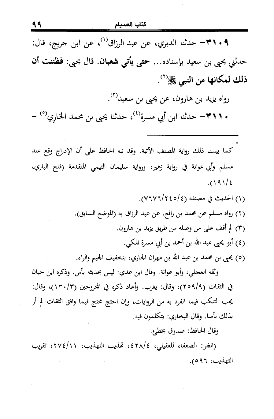 3109 - حدثنا الدبري، عن عبد الرزاق (¬1)، عن ابن جريج، قال: حدثني يحيى بن سعيد بإسناده ... حتى يأتي شعبان. قال يحيى: فظننت أن ذلك لمكانها من النبي -صلى الله عليه وسلم- (¬2).