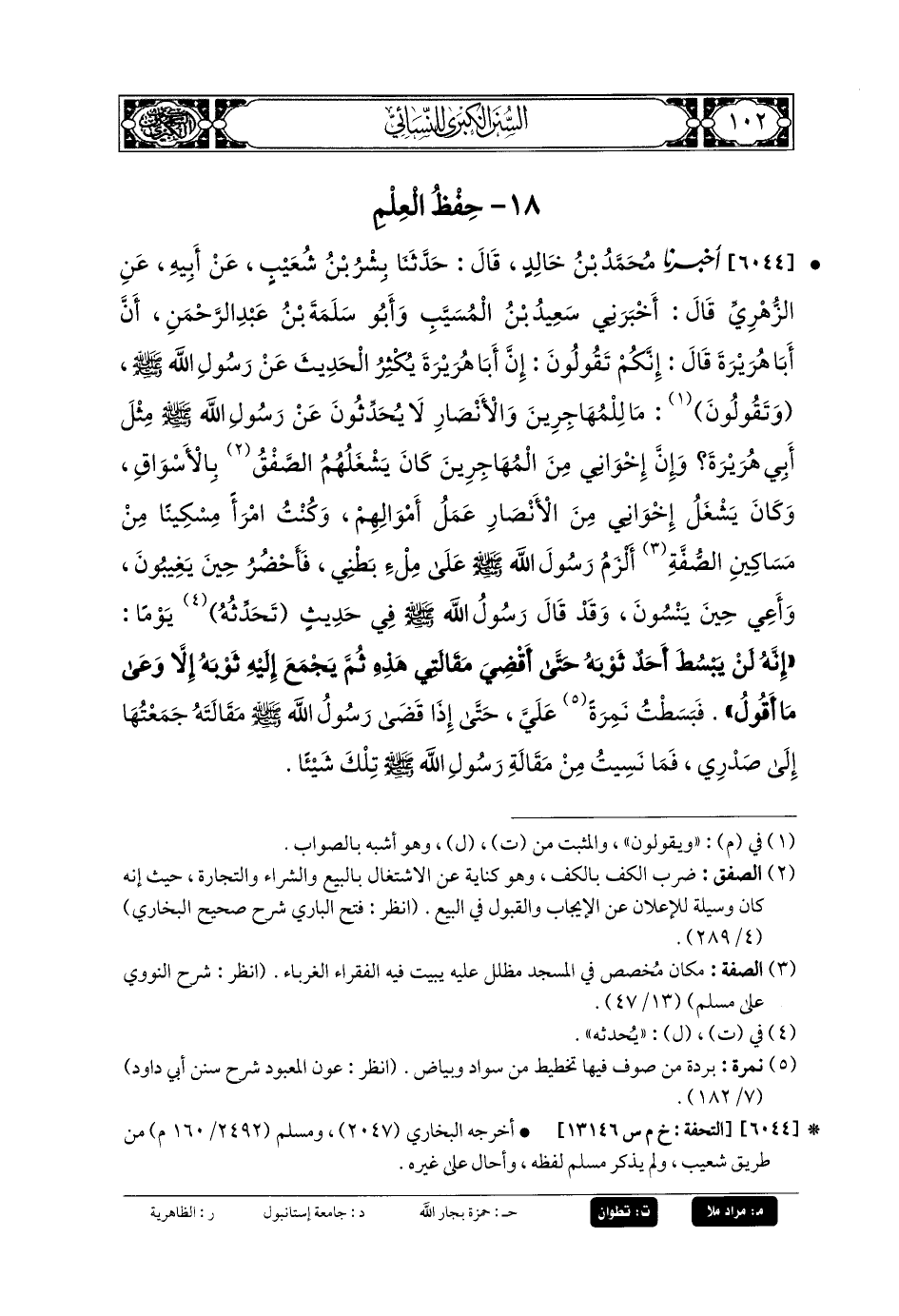 6044- أَخبَرنا مُحَمدُ بنُ خَالِدٍ، قَالَ: حَدثنا بِشْرُ بنُ شُعَيْبٍ، عَن أَبيهِ، عَنِ الزُّهْرِيِّ، قَالَ: أَخبَرني سَعِيدُ بنُ المُسَيَّبِ، وَأَبو سَلَمَةَ بنُ عَبدِ الرَّحمَنِ، أَنَّ أَبَا هُرَيرَةَ، قَالَ: إِنَّكُمْ تَقُولُونَ: إِنَّ أَبَا هُرَيرَةَ يُكْثِرُ الحَدِيثَ عَن رَسُولِ اللهِ صَلى الله عَليه وسَلم، وَتقُولُونَ: مَا لِلْمُهَاجِرِينَ، وَالأَنْصَارِ لا يُحَدِّثُونَ عَن رَسُولِ اللهِ صَلى الله عَليه وسَلم مِثْلَ أَبي هُرَيرَةَ، وَإنَّ إِخْوَانِي مِنَ المُهَاجِرِينَ كَانَ يَشْغَلُهُمُ الصَّفْقُ بِالأَسْوَاقِ، وَكَانَ يَشْغَلُ إِخْوَانِي مِنَ الأَنْصَارِ عَمَلُ أَمْوَالِهِمْ، وَكُنْتُ امْرَءًا مِسْكِينًا مِنْ مَسَاكِينِ الصُّفَّةِ، أَلْزَمُ رَسُولَ اللهِ صَلى الله عَليه وسَلم عَلَى مِلْءِ بَطْنِي، فَأَحْضُرُ حِينَ يَغِيبُونَ، وَأَعِي حِينَ يَنْسَوْنَ، وَقَدْ قَالَ رَسُولُ اللهِ صَلى الله عَليه وسَلم فِي حَدِيثٍ تحَدِّثُهُ يَوْمًا، إِنَّهُ لَنْ يَبْسُطَ أَحَدٌ ثَوْبَهُ حَتَّى أَقْضِيَ مَقَالَتِي هَذِهِ، ثُمَّ يَجْمَعَ إِلَيْهِ ثَوْبَهُ إِلاَّ وَعَى مَا أَقُولُ، فَبَسَطْتُ نَمِرَةً عَلَيَّ، حَتَّى إِذَا قَضَى رَسُولُ اللهِ صَلى الله عَليه وسَلم مَقَالَتَهُ جَمَعْتُهَا إِلَى صَدْرِي، فَمَا نَسِيتُ مِنْ مَقَالَةِ رَسُولِ اللهِ صَلى الله عَليه وسَلم تِلْكَ شَيْئًا.