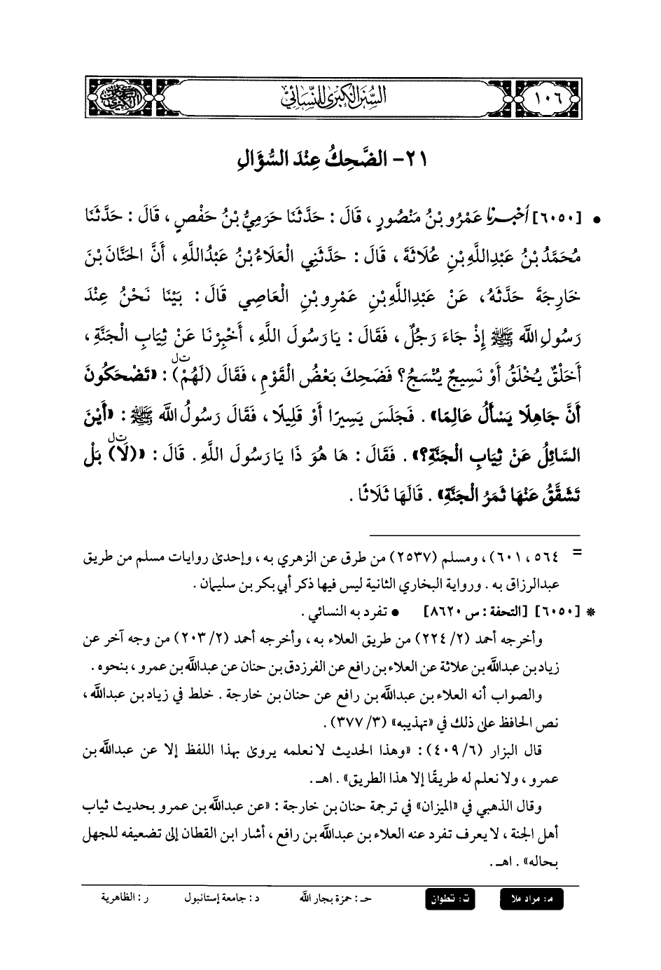 6050- أَخبَرنا عَمْرُو بنُ مَنصُورٍ، قَالَ: حَدثنا حَرَمِيُّ بنُ حَفْصٍ، قَالَ: حَدثنا مُحَمدُ بنُ عَبدِ اللهِ بنِ عُلاثَةَ، قَالَ: حَدَّثني العَلاءُ بنُ عَبدِ اللهِ، أَنَّ الحَنَّانَ بْنَ خَارِجَةَ حَدَّثَهُ عَن عَبدِ اللهِ بنِ عَمْرِو بنِ العَاصي، قَالَ: بَيْنَا نَحْنُ عِنْدَ رَسُولِ اللهِ صَلى الله عَليه وسَلم إِذْ جَاءَهُ رَجُلٌ فَقَالَ: يَا رَسُولَ اللهِ، أَخْبِرْنَا عَن ثِيَابِ الجَنَّةِ، أَخُلُقٌ يُخْلَقُ أَوْ نَسِيجٌ يُنْسَجُ، فَضَحِكَ بَعْضُ القَوْمِ، فَقَالَ لَهُمْ: تَضْحَكُونَ أَنَّ جَاهِلاً يَسْأَلُ عَالِمًا، فَجَلَسَ يَسِيرًا أَوْ قَلِيلاً، فَقَالَ رَسُولُ اللهِ صَلى الله عَليه وسَلم: أَيْنَ السَّائِلُ عَن ثِيَابِ الجَنَّةِ؟ فَقَالَ: هَا هُوَ ذَا يَا رَسُولَ اللهِ، قَالَ: لا بَلْ تُشَقَّقُ عَنهَا ثَمَرُ الجَنَّةِ، قَالَهَا ثَلاثًا.