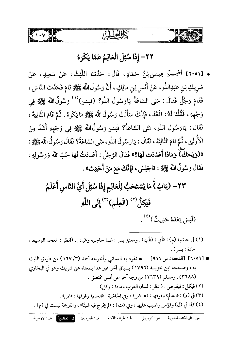 6051- أَخبَرنا عِيسَى بنُ حَمَّادٍ، قَالَ: حَدثنا اللَّيْثُ، عَن سَعِيدٍ، عَن شَرِيكِ بنِ عَبدِ اللهِ، عَن أَنَسِ بنِ مَالِكٍ، أَنَّ رَسُولَ اللهِ صَلى الله عَليه وسَلم قَامَ فَحَدَّثَ النَّاسَ، فَقَامَ رَجُلٌ، فَقَالَ: مَتَى السَّاعَةُ يَا رَسُولَ اللهِ؟ فَبَسَرَ رَسُولُ اللهِ صَلى الله عَليه وسَلم فِي وَجْهِهِ، فَقُلْنَا لَهُ: اقْعُدْ فَإِنَّكَ سَأَلْتَ رَسُولَ اللهِ صَلى الله عَليه وسَلم مَا يَكْرَهُ، ثُمَّ قَامَ الثَّانِيَةَ، فَقَالَ: يَا رَسُولَ اللهِ مَتَى السَّاعَةُ؟ فَبَسَرَ رَسُولُ اللهِ صَلى الله عَليه وسَلم فِي وَجْهِهِ أَشَدَّ مِنَ الأُولَى، ثُمَّ قَامَ الثَّالِثَةَ، فَقَالَ: يَا رَسُولَ اللهِ مَتَى السَّاعَةُ؟ فَقَالَ رَسُولُ اللهِ صَلى الله عَليه وسَلم: وَيْحَكَ وَمَاذَا أَعْدَدْتَ لَهَا؟ فَقَالَ الرَّجُلُ: أَعْدَدْتُ لَهَا حُبَّ اللهِ وَرَسُولِهِ، فَقَالَ رَسُولُ اللهِ صَلى الله عَليه وسَلم: اجْلِسْ فَإِنَّكَ مَعَ مَنْ أَحْبَبْتَ.