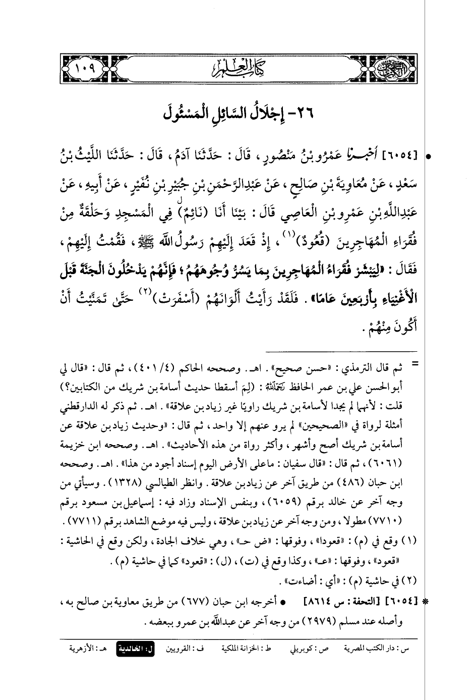 6054- أَخبَرنا عَمْرُو بنُ مَنصُورٍ، قَالَ: حَدثنا آدَمُ، قَالَ: حَدثنا اللَّيْثُ بنُ سَعْدٍ، عَن مُعاويَةَ بنِ صَالِحٍ، عَن عَبدِ الرَّحمَنِ بنِ جُبَيْرِ بنِ نُفَيْرٍ، عَن أَبيهِ، عَن عَبدِ اللهِ بنِ عَمْرِو بنِ العَاصي، قَالَ: بَيْنَا أَنَا نائم فِي المَسْجِدِ وَحَلْقَةٌ مِنْ فُقَرَاءِ المُهَاجِرِينَ قُعُودٌ، إِذْ قَعَدَ إِلَيْهِمْ رَسُولُ اللهِ صَلى الله عَليه وسَلم فَقُمْتُ إِلَيْهِمْ، فَقَالَ: لِيُبْشِرْ فُقَرَاءُ المُهَاجِرِينَ بِمَا يَسُرُّ وُجُوهَهُمْ، فَإِنَّهُمْ يَدْخُلُونَ الجَنَّةَ قَبْلَ الأَغْنِيَاءِ بِأَرْبَعِينَ عَامًا، فَلَقَدْ رَأَيْتُ أَلْوَانَهُمْ أَسْفَرَتْ حَتَّى تَمَنَّيْتُ أَنْ أَكُونَ مِنْهُمْ.