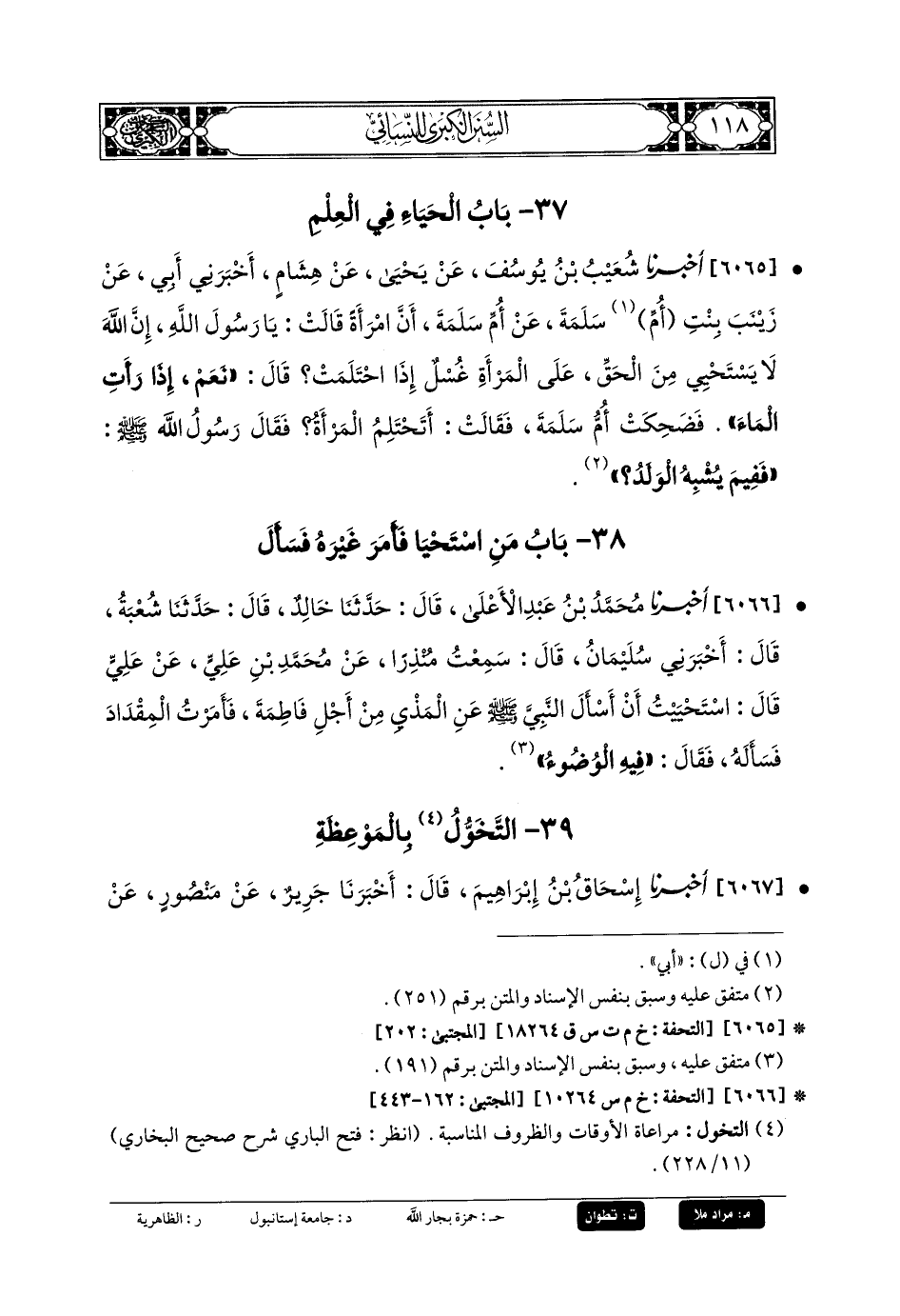 6065- أَخبَرنا شُعَيْبُ بنُ يُوسُفَ، عَن يَحيَى، عَن هِشَامٍ، قَالَ: أَخبَرني أَبي، عَن زَيْنَبَ بِنْتِ أُمِّ سَلَمَةَ، عَن أُمِّ سَلَمَةَ، أَنَّ امْرَأَةً قَالَتْ: يَا رَسُولَ اللهِ، إِنَّ اللهَ لا يَسْتَحْيِي مِنَ الحَقِّ عَلَى المَرْأَةِ غُسْلٌ إِذَا احْتَلَمَتْ؟ قَالَ: نَعَمْ، إِذَا رَأَتِ المَاءَ، فَضَحِكَتْ أُمُّ سَلَمَةَ، فَقَالَتْ: أَتَحْتَلِمُ المَرْأَةُ؟ فَقَالَ رَسُولُ اللهِ صَلى الله عَليه وسَلم: فَفِيمَ يُشْبِهُ الوَلَدُ؟.