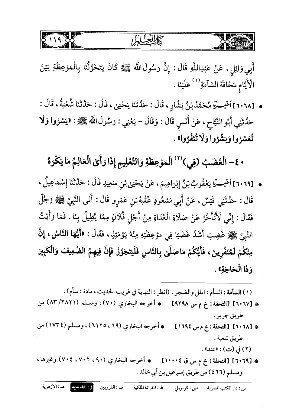 40- الغَضَبُ فِي المَوْعِظَةِ وَالتَّعْلِيمِ إِذَا رَأَى العَالِمُ مَا يَكْرَهُ.