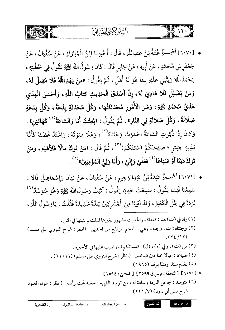 6070 - أَخبَرنا عُتْبَةُ بنُ عَبدِ اللهِ، قَالَ: أَخبَرنا ابنُ المُبَارَكِ، عَن سُفيانَ، عَن جَعفَرِ بنِ مُحَمدٍ، عَن أَبيهِ، عَن جَابِرٍ، قَالَ: كَانَ رَسُولُ اللهِ صَلى الله عَليه وسَلم يَقُولُ فِي خُطْبَتِهِ: يَحْمَدُ اللهَ، وَيُثْنِي عَلَيْهِ بِمَا هُوَ لَهُ أَهْلٌ، ثُمَّ يَقُولُ: مَنْ يَهْدِ اللهُ فَلا مُضِلَّ لَهُ، وَمَنْ يُضْلِلْ فَلا هَادِيَ لَهُ، إِنَّ أَصَدَقَ الحَدِيثِ كِتَابُ اللهِ، وَأَحْسَنَ الهَدْيِ هَدْيُ مُحَمدٍ صَلى الله عَليه وسَلم، وَشَرَّ الأُمُورِ مُحْدَثَاتُهَا، وَكُلَّ مُحْدَثَةٍ بِدْعَةٌ، وَكُلَّ بِدْعَةٍ ضَلالَةٌ، وَكُلَّ ضَلالَةٍ فِي النَّارِ، ثُمَّ يَقُولُ: بُعِثْتُ أَنَا وَالسَّاعَةِ مَعًا كَهَاتَيْنِ، وَكَانَ إِذَا ذُكِرَتِ السَّاعَةُ احْمَرَّتْ وَجْنَتَاهُ، وَعَلا صَوْتُهُ، وَاشْتَدَّ غَضَبُهُ، كَأَنَّهُ نَذِيرُ جَيْشٍ صَبَّحَتْكُمْ مَسَّتْكُمْ، ثُمَّ قَالَ: مَنْ تَرَكَ مَالاً، فَلأَهْلِهِ، وَمَنْ تَرَكَ دَيْنًا أَوْ ضَيَاعًا، فَعَلَيَّ وَإِلَيَّ، وَأَنَا وَلِيُّ المُؤْمِنِينَ.