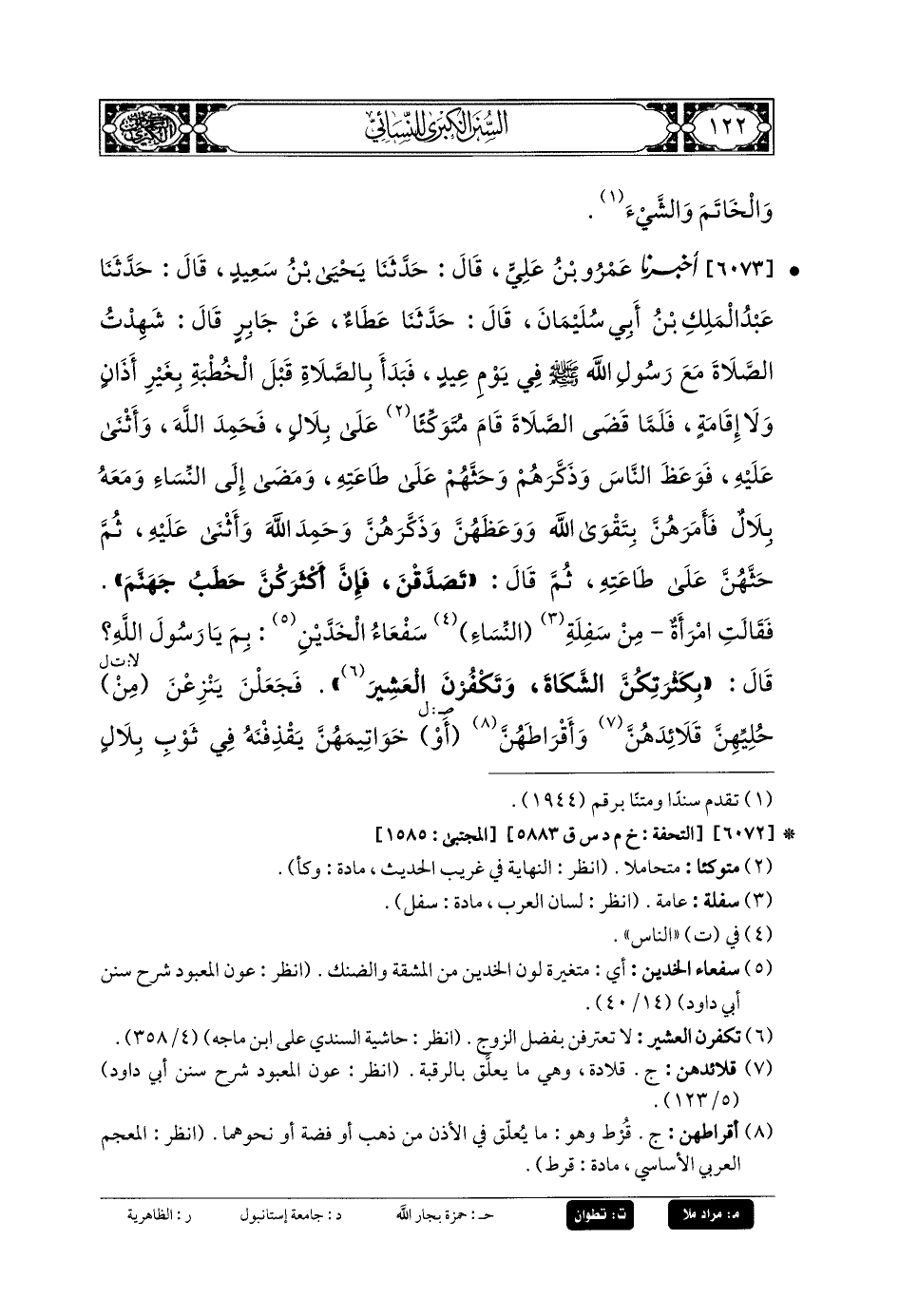 6073- أَخبَرنا عَمْرُو بنُ عَليٍّ، قَالَ: حَدثنا يَحيَى بنُ سَعِيدٍ، قَالَ: حَدثنا عَبدُ المَلِكِ بنُ أَبي سُلَيمَانَ، قَالَ: حَدثنا عَطَاءٌ، عَن جَابِرٍ، قَالَ: شَهِدْتُ الصَّلاةَ مَعَ رَسُولِ اللهِ صَلى الله عَليه وسَلم فِي يَوْمِ عِيدٍ، فَبَدَأَ بِالصَّلاةِ قَبْلَ الخُطْبَةِ بِغَيْرِ أَذَانٍ، وَلا إِقَامَةٍ، فَلَمَّا قَضَى الصَّلاةَ، قَامَ مُتَوَكِئًا عَلَى بِلالٍ، فَحَمِدَ اللهَ وَأَثْنَى عَلَيْهِ، فَوَعَظَ النَّاسَ، وَذَكَّرَهُمْ، وَحَثَّهُمْ عَلَى طَاعَتِهِ، وَمَضَى إِلَى النِّسَاءِ، وَمَعَهُ بِلالٌ، فَأَمَرَهُنَّ بِتَقْوَى اللهِ، وَوَعَظَهُنَّ، وَذَكَّرَهُنَّ، وَحَمِدَ اللهَ وَأَثْنَى عَلَيْهِ، ثُمَّ حَثَّهُنَّ عَلَى طَاعَتِهِ، ثُمَّ قَالَ: تَصَدَّقْنَ فَإِنَّ أَكْثَرَكُنَّ حَطَبُ جَهَنَّمَ، فَقَالَتِ امْرَأَةٌ مِنْ سَفِلَةِ النَّسَاءِ، سَفْعَاءُ الخَدَّيْنِ: بِمَ يَا رَسُولَ اللهِ؟ قَالَ: بِكَثْرَتِكُنَّ الشِّكَاةَ، وَتَكْفُرْنَ العَشِيرَ، فَجَعَلْنَ يَنْزِعْنَ مِنْ حُلِيَّهِنَّ قَلائِدَهُنَّ، وَأَقْرِطَتَهُنَّ، أَوْ خَوَاتِيمَهُنَّ، يَقْذِفْنَهُ فِي ثَوْبِ بِلالٍ يَتَصَدَّقْنَ بِهِ.