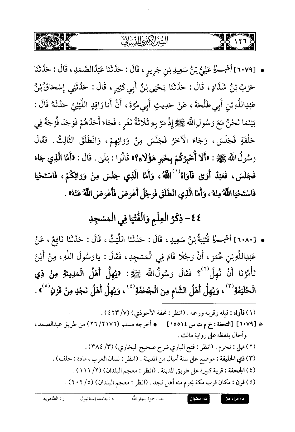 6080- أَخبَرنا قُتَيبَةُ بنُ سَعِيدٍ، قَالَ: حَدثنا اللَّيْثُ، قَالَ: حَدثنا نَافِعٌ، عَن عَبدِ اللهِ بنِ عُمَرَ، أَنَّ رَجُلاً قَامَ فِي المَسْجِدِ فَقَالَ: يَا رَسُولَ اللهِ، مِنْ أَيْنَ تَأْمُرُنَا أَنْ نُهِلَّ؟ فَقَالَ رَسُولُ اللهِ صَلى الله عَليه وسَلم: يُهِلُّ أَهْلُ المَدِينَةِ مِنْ ذِي الحُلَيْفَةِ، وَيُهِلُّ أَهْلُ الشَّامِ مِنَ الجُحْفَةِ، وَيُهِلُّ أَهْلُ نَجْدٍ مِنْ قَرْنٍ.