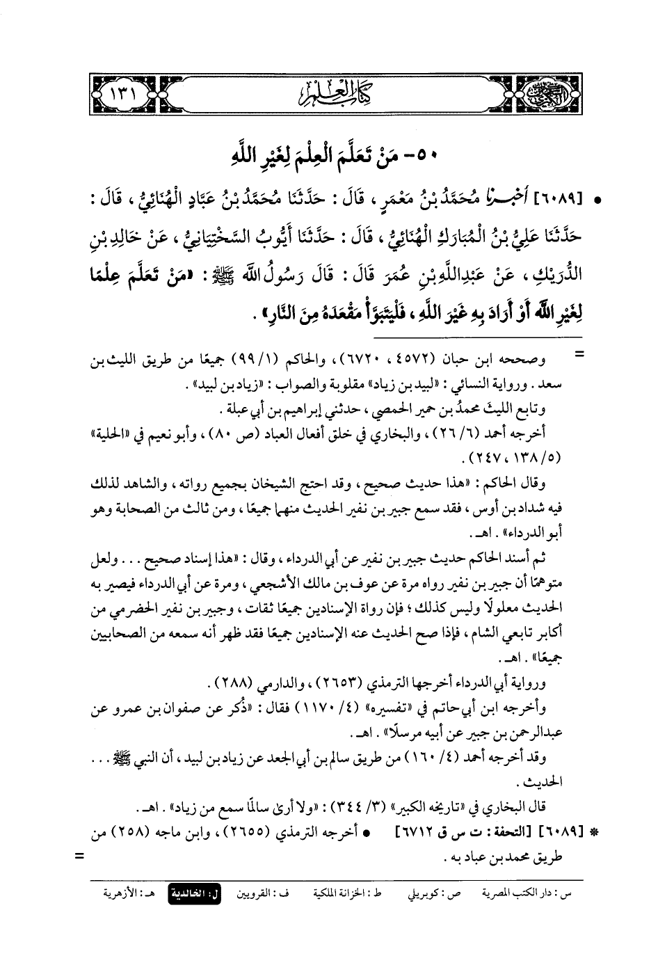 6089- أَخبَرنا مُحَمدُ بنُ مَعْمَرٍ، قَالَ: حَدثنا مُحَمدُ بنُ عَبَّادٍ الهُنَائِيُّ، قَالَ: حَدثنا عَليُّ بنُ المُبَارَكِ الهُنَائِيُّ، قَالَ: حَدثنا أَيوبُ السَّخْتِيَانِيُّ، عَن خَالِدِ بنِ الدُّرَيْكِ، عَن عَبدِ اللهِ بنِ عُمَرَ، قَالَ: قَالَ رَسُولُ اللهِ صَلى الله عَليه وسَلم: مَنْ تَعَلَّمَ عِلْمًا لِغَيْرِ اللهِ، أَوْ أَرَادَ بِهِ غَيْرَ اللهِ، فَلْيَتَبَوَّأْ مَقْعَدَهُ مِنَ النَّارِ.