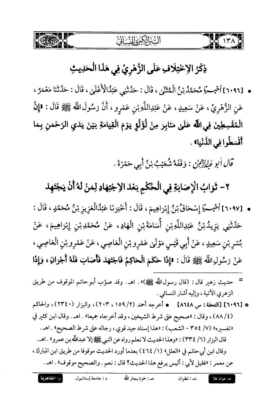6097- أَخبَرنا إِسحَاقُ بنُ إِبرَاهِيمَ، قَالَ: أَخبَرنا عَبدُ العَزِيزِ بنُ مُحَمدٍ، قَالَ: حَدَّثني يَزِيدُ بنُ عَبدِ اللهِ بنِ أُسَامَةَ بنِ الهَادِ، عَن مُحَمدِ بنِ إِبرَاهِيمَ، عَن بُسْرِ بنِ سَعِيدٍ، عَن أَبي قَيسٍ، مَوْلَى عَمْرِو بنِ العَاصي، عَن عَمْرِو بنِ العَاصي، عَن رَسُولِ اللهِ صَلى الله عَليه وسَلم قَالَ: إِذَا حَكَمَ الحَاكِمُ، فَاجْتَهَدَ فَأَصَابَ، فَلَهُ أَجْرَانِ، وَإِذَا حَكَمَ، فَاجْتَهَدَ فَأَخْطَأَ، فَلَهُ أَجْرٌ وَاحِدٌ.