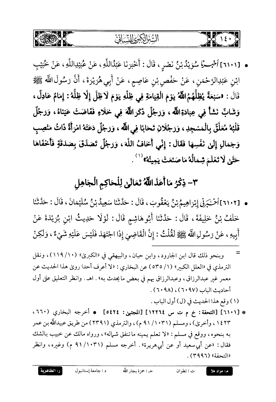 6101- أَخبَرنا سُوَيْدُ بنُ نَصْرٍ، قَالَ: أَخبَرنا عَبدُ اللهِ، عَن عُبَيدِ اللهِ، عَن خُبَيْبِ بنِ عَبدِ الرَّحمَنِ، عَن حَفْصِ بنِ عَاصِمٍ، عَن أَبي هُرَيرَةَ، أَنَّ رَسُولَ اللهِ صَلى الله عَليه وسَلم قَالَ: سَبْعَةٌ يُظِلُّهُمُ اللهُ يَوْمَ القِيَامَةِ فِي ظِلِّهِ، يَوْمَ لا ظِلَّ إِلاَّ ظِلُّهُ: إِمَامٌ عَادِلٌ، وَشَابٌّ نَشَأَ فِي عِبَادَةِ اللهِ، وَرَجُلٌ ذَكَرَ اللهَ فِي خَلاءٍ فَفَاضَتْ عَيْنَاهُ، وَرَجُلٌ قَلْبُهُ مُعَلَّقٌ بِالمَسْجِدِ، وَرَجُلانِ تَحَابَّا فِي اللهِ، وَرَجُلٌ دَعَتْهُ امْرَأَةٌ ذَاتُ مَنصِبٍ وَجَمَالٍ إِلَى نَفْسِهَا، فَقَالَ: إِنِّي أَخَافُ اللهَ، وَرَجُلٌ تَصَدَّقَ بِصَدَقَةٍ فَأَخْفَاهَا حَتَّى لا تَعْلَمَ شِمَالُهُ مَا صَنَعَتْ يَمِينُهُ.
