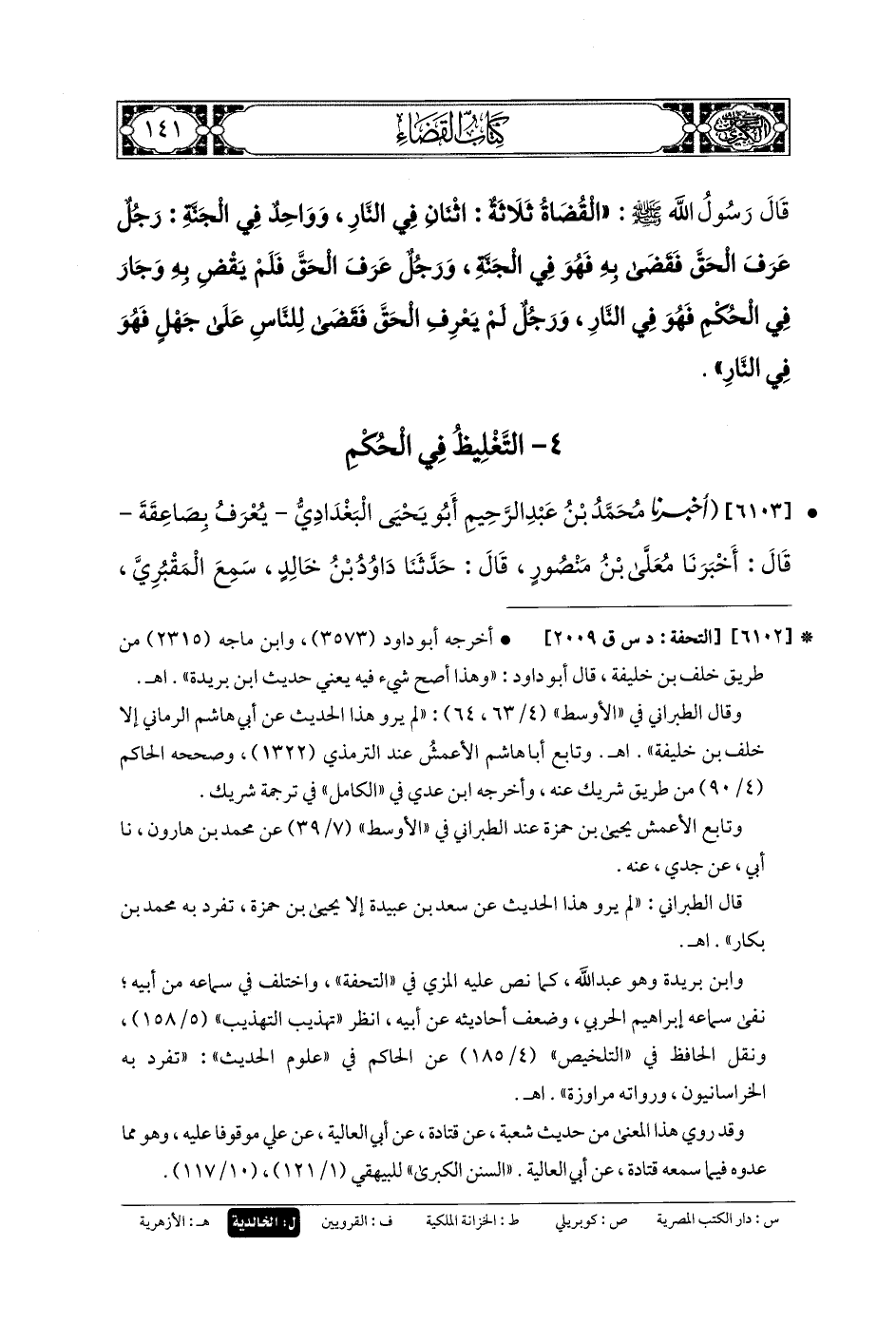 6103- أَخبَرنا مُحَمدُ بنُ عَبدِ الرَّحِيمِ أَبو يَحيَى البَغْدَادِيُّ يُعْرَفُ بِصَاعِقَةَ، قَالَ: أَخبَرنا مُعَلَّى بنُ مَنصُورٍ، قَالَ: حَدثنا دَاوُدُ بنُ خَالِدٍ، سَمِعَ المَقْبُرِيَّ يُحَدِّثُ عَن أَبي هُرَيرَةَ، يُحَدِّثُ عَنِ النَّبيِّ صَلى الله عَليه وسَلم قَالَ: مَنْ جُعِلَ قَاضِيًا، فَقَدْ ذُبِحَ بِغَيْرِ سِكِّينٍ.