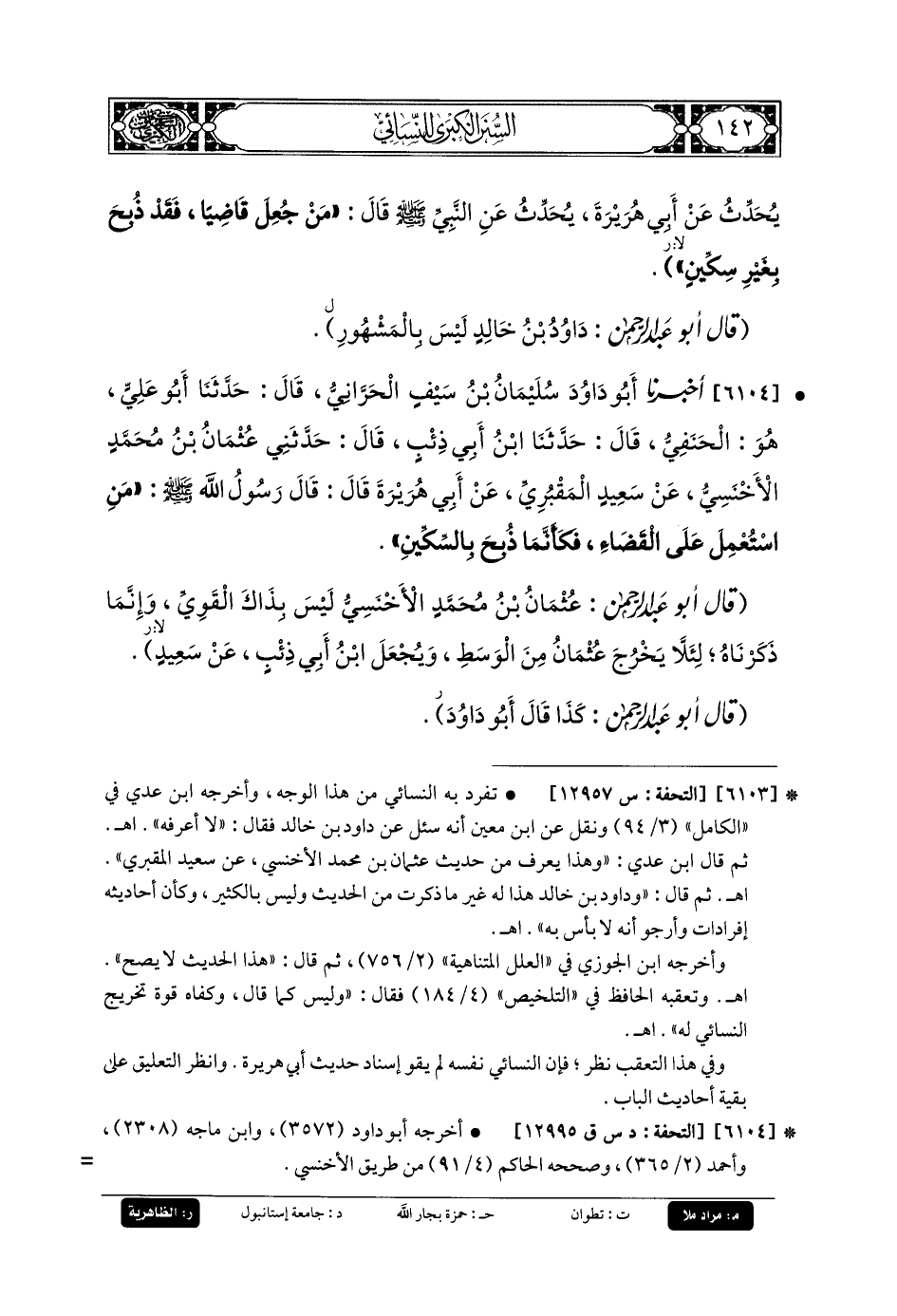6104- أَخبَرنا أَبو دَاوُدَ سُلَيمَانُ بنُ سَيْفٍ الحَرَّانِيِّ، قَالَ: حَدثنا أَبو عَليٍّ، هُوَ الحَنَفِيُّ، قَالَ: حَدثنا ابنُ أَبي ذِئْبٍ، قَالَ: حَدَّثني عُثْمَانُ بنُ مُحَمدٍ الأَخْنَسِيُّ، عَن سَعِيدٍ المَقْبُرِيِّ، عَن أَبي هُرَيرَةَ، قَالَ: قَالَ رَسُولُ اللهِ صَلى الله عَليه وسَلم: مَنِ اسْتُعْمِلَ عَلَى القَضَاءِ، فَكَأَنَّمَا ذُبِحَ بِالسِّكِّينِ.