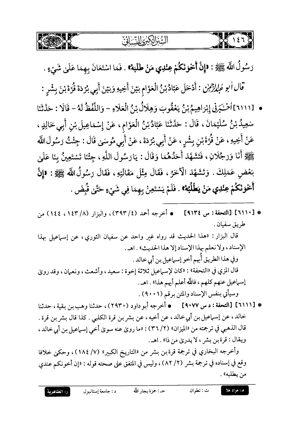 6111- أَخبَرني إِبرَاهِيمُ بنُ يَعْقُوبَ، وَهِلالُ بنُ العَلاءِ، وَاللَّفْظُ لَهُ، قَالا: حَدثنا سَعِيدُ بنُ سُلَيمَانَ، قَالَ: حَدثنا عَبَّادُ بنُ العَوَّامِ، عَن إِسمَاعِيلَ بنِ أَبي خَالِدٍ، عَن أَخِيهِ، عَن قُرَّةَ بنِ بِشْرٍ، عَن أَبي بُرْدَةَ، عَن أَبي مُوسَى، قَالَ: جئتُ رَسُولَ اللهِ صَلى الله عَليه وسَلم أَنَا وَرَجُلانِ فَتَشَهَّدَ أَحَدُهُمَا، وَقَالَ: يَا رَسُولَ اللهِ، جِئْنَا تَسْتَعِينُ بِنَا عَلَى بَعْضِ عَمَلِكَ، وَتَشَهَّدَ الآخَرُ، فَقَالَ مِثْلَ مَقَالَتِهِ، فَقَالَ رَسُولُ اللهِ صَلى الله عَليه وسَلم: إِنَّ أَخْوَنَكُمْ عِنْدِي مَنْ يَطْلُبُهُ، فَلَمْ يَسْتَعِنْ بِهِمَا فِي شَيْءٍ حَتَّى قُبِضَ.