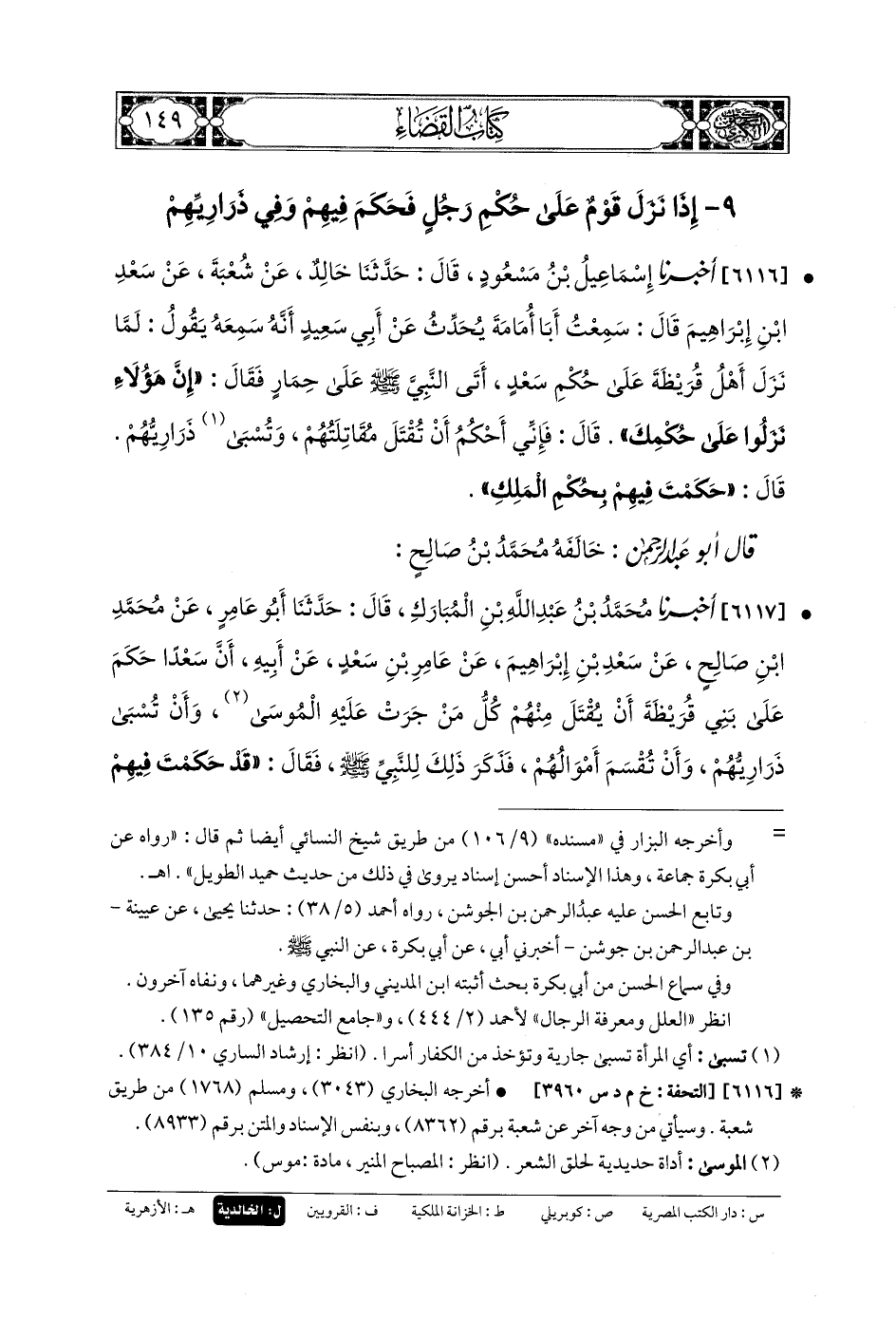 9- إِذَا نَزَلَ قَوْمٌ عَلَى حُكْمِ رَجُلٍ فَحَكَمَ فِيهِمْ وَفِي ذَرَارِيِّهِمْ.