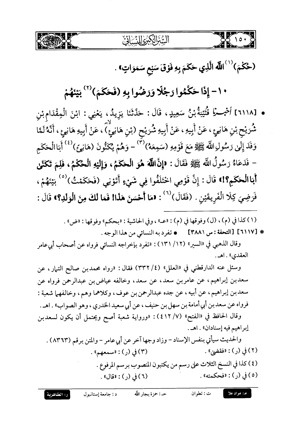 6118- أَخبَرنا قُتَيبَةُ، قَالَ: حَدثنا يَزِيدُ، يَعْنِي ابنَ المِقْدَامِ بنِ شُرَيْحِ بنِ هَانِئٍ، عَن أَبيهِ، عَن أَبيهِ شُرَيْحٍ بنِ هَانِئٍ، عَن أَبيهِ هَانِئٍ؛ أَنَّهُ لَمَّا وَفَدَ إِلَى رَسُولِ اللهِ صَلى الله عَليه وسَلم مَعَ قَوْمِهِ سَمِعَهُمْ (1) وَهُمْ يَكْنُونَ هَانِئًا أَبَا الحَكَمِ، فَدَعَاهُ رَسُولُ اللهِ صَلى الله عَليه وسَلم فَقَالَ لَهُ: إِنَّ اللهَ هُوَ الحَكَمُ، وَإِلَيْهِ الحُكْمُ، فَلِمَ تُكَنَّى أَبَا الحَكَمِ؟ قَالَ: إِنَّ قَوْمِي اخْتَلَفُوا فِي شَيْءٍ أَتَوْنِي، فَحَكَمْتُ بَيْنَهُمْ فَرَضِيَ كِلا الفَرِيقَيْنِ، فَقَالَ: مَا أَحْسَنَ هَذَا، فَمَا لَكَ مِنَ الوَلَدِ؟ قَالَ: لِي شُرَيْحٌ، وَعَبدُ اللهِ، وَمُسْلِمٌ، قَالَ: مَنْ أَكْبَرُهُمْ؟ قَالَ: شُرَيْحٌ، قَالَ: فَأَنْتَ أَبو شُرَيْحٍ، وَدَعَا لَهُ وَلِوَلَدِهِ.
