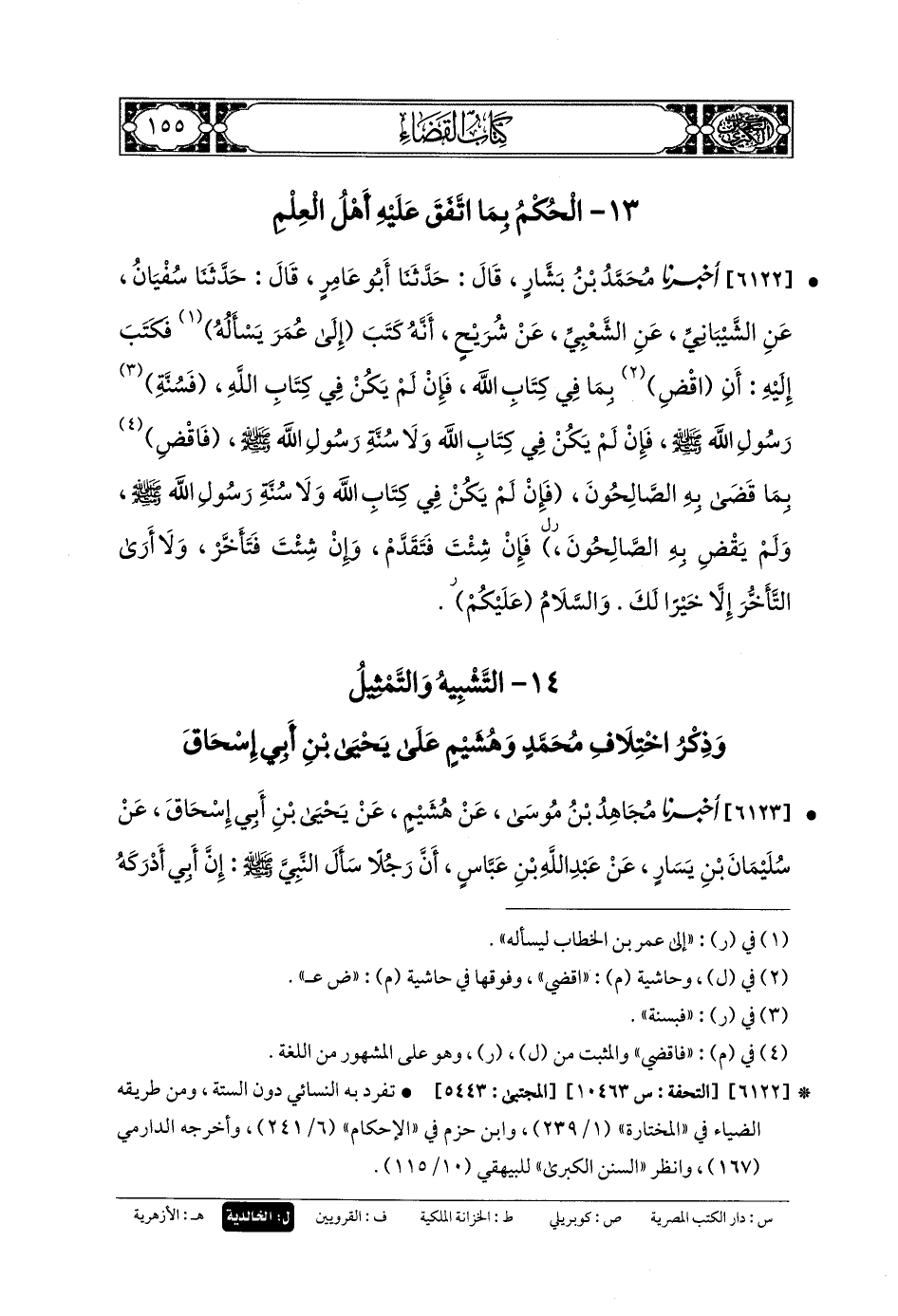 6122 - أَخبَرنا مُحَمدُ بنُ بَشَّارٍ، قَالَ: حَدثنا أَبو عَامِرٍ، قَالَ: حَدثنا سُفيانُ، عَنِ الشَّيْبَانِيِّ، عَنِ الشَّعْبِيِّ، عَن شُرَيْحٍ، أَنَّهُ كَتَبَ إِلَى عُمَرَ يَسْأَلُهُ، فَكَتَبَ إِلَيْهِ: أَنِ اقْضِ بِمَا فِي كِتَابِ اللهِ، فَإِنْ لَمْ يَكُنْ فِي كِتَابِ اللهِ، فَسُنَّةِ رَسُولِ اللهِ صَلى الله عَليه وسَلم، فَإِنْ لَمْ يَكُنْ فِي كِتَابِ اللهِ، وَلا سُنَّةِ رَسُولِ اللهِ صَلى الله عَليه وسَلم، فَاقْضِ بِمَا قَضَى بِهِ الصَّالِحُونَ، فَإِنْ لَمْ يَكُنْ فِي كِتَابِ اللهِ، وَلا فِي سُنَّةِ رَسُولِ اللهِ صَلى الله عَليه وسَلم، وَلَمْ يَقْضِ بِهِ الصَّالِحُونَ، فَإِنْ شِئْتَ فَتَقَدَّمْ، وَإِنْ شِئْتَ فَتَأَخَّرْ، وَلا أَرَى التَّأَخُّرَ إِلاَّ خَيْرًا لَكَ، وَالسَّلامُ عَلَيْكُمْ.