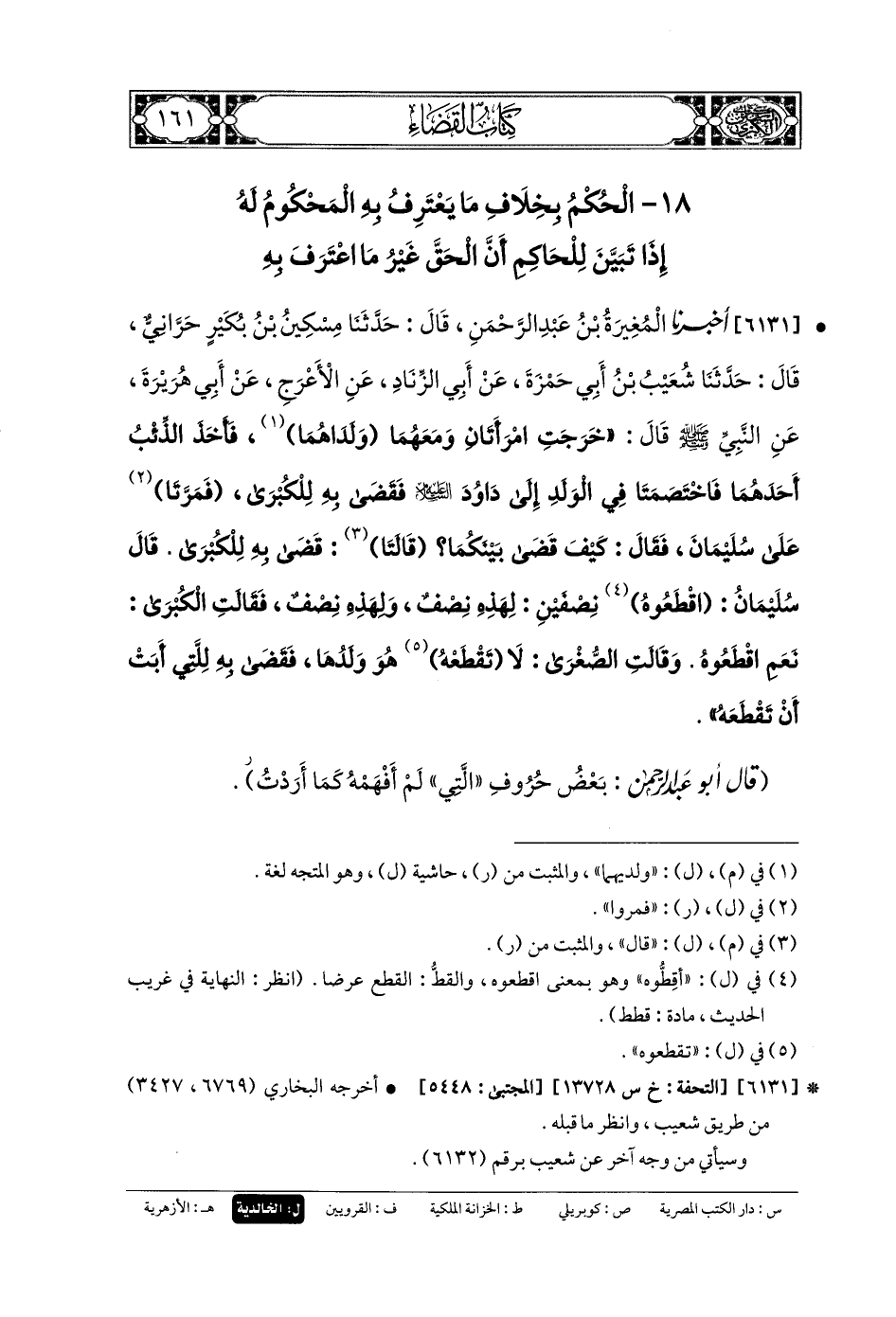 6131- أَخبَرنا المُغِيرَةُ بنُ عَبدِ الرَّحمَنِ، قَالَ: حَدثنا مِسْكِينُ بنُ بُكَيْرٍ حَرَّانِيٌّ، قَالَ: حَدثنا شُعَيْبُ بنُ أَبي حَمْزَةَ، عَن أَبي الزِّنَادِ، عَنِ الأَعْرَجِ، عَن أَبي هُرَيرَةَ، عَنِ النَّبيِّ صَلى الله عَليه وسَلم، قَالَ: خَرَجَتِ امْرَأَتَانِ وَمَعَهُمَا وَلَدَاهُمَا، فَأَخَذَ الذِّئْبُ أَحَدَهُمَا، فَاخْتَصَمَتَا فِي الوَلَدِ إِلَى دَاوُدَ عَلَيْهِ السَّلامُ، فَقَضَى بِهِ لِلْكُبْرَى، فَمَرَّتَا عَلَى سُلَيمَانَ، فَقَالَ: كَيْفَ قَضَى بَيْنَكُمَا؟ قَالَتَا: قَضَى بِهِ لِلْكُبْرَى، قَالَ سُلَيمَانُ: اقْطَعُوهُ نِصْفَيْنِ، لِهَذِهِ نِصْفٌ وَلِهَذِهِ نِصْفٌ، فَقَالَتِ الكُبْرَى: نَعَمِ اقْطَعُوهُ، وَقَالَتِ الصُّغْرَى: لا تَقْطَعُهُ هُوَ وَلَدُهَا، فَقَضَى بِهِ لِلَّتِي أَبَتْ أَنْ تَقْطَعَهُ.