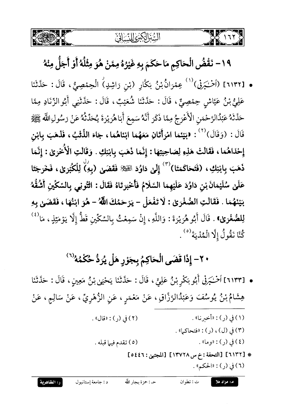 6132- أَخبَرنا عِمْرَانُ بنُ بَكَّارٍ بن راشد الحِمْصِيُّ، قَالَ: حَدثنا عَليُّ بنُ عَيَّاشٍ، حِمْصِيٌّ، قَالَ: حَدثنا شُعَيْبٌ، قَالَ: حَدَّثني أَبو الزِّنَادِ، مِمَّا حَدَّثَهُ عَبدُ الرَّحمَنِ الأَعْرَجُ، مِمَّا ذَكَرَ أَنَّهُ سَمِعَ أَبَا هُرَيرَةَ يُحَدِّثُهُ عَن رَسُولِ اللهِ صَلى الله عَليه وسَلم قَالَ: وَقَالَ: بَيْنَمَا امْرَأَتَانِ مَعَهُمَا ابنَاهُمَا جَاءَ الذِّئْبُ، فَذَهَبَ بِابْنِ إِحْدَاهُمَا، فَقَالَتْ هَذِهِ لِصَاحِبَتِهَا: إِنَّمَا ذَهَبَ بِابْنِكِ، وَقَالَتِ الأُخْرَى: إِنَّمَا ذَهَبَ بِابْنِكِ، فَتَحَاكَمَتَا إِلَى دَاوُدَ عَلَيْهِ السَّلامُ، فَقَضَى به لِلْكُبْرَى، فَخَرَجَتَا عَلَى سُلَيمَانَ بنِ دَاوُدَ عَلَيْهِمَا السَّلامُ، فَأَخْبَرَتَاهُ، فَقَالَ: ائْتُونِي بِالسِّكِّينِ أَشُقُّهُ بَيْنَهُمَا، فَقَالَتِ الصُّغْرَى: لا تَفْعَلْ يَرْحَمُكَ اللهُ، هُوَ ابنُهَا، فَقَضَى بِهِ لِلصُّغْرَى، قَالَ أَبو هُرَيرَةَ: وَاللهِ إِنْ سَمِعْتُ بِالسِّكِّينِ قَطُّ إِلاَّ يَوْمَئِذٍ، وَمَا كُنَّا نَقُولُ إِلاَّ المُدْيَةَ.