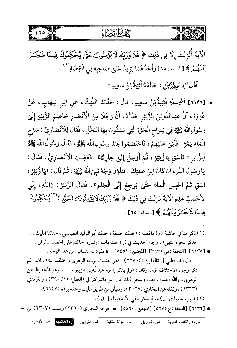 6136- أَخبَرنا قُتَيبَةُ بنُ سَعِيدٍ، قَالَ: حَدثنا اللَّيْثُ، عَنِ ابنِ شِهَابٍ، عَن عُرْوَةَ، أَنَّ عَبدَ اللهِ بْنَ الزُّبَيْرِ حَدَّثَهُ، أَنَّ رَجُلاً مِنَ الأَنْصَارِ خَاصَمَ الزُّبَيْرَ إِلَى رَسُولِ اللهِ صَلى الله عَليه وسَلم فِي شِرَاجِ الحَرَّةِ الَّتِي يَسْقُونَ بِهَا النَّخْلَ، فَقَالَ لِلأَنْصَارِيِّ: سَرِّحِ المَاءَ يَمُرُّ، فَأَبَى عَلَيْهِ، فَاخْتَصَمُوا عِنْدَ رَسُولِ اللهِ صَلى الله عَليه وسَلم، فَقَالَ رَسُولُ اللهِ صَلى الله عَليه وسَلم لِلزُّبَيْرِ: أَسْقِ يَا زُبَيْرُ، ثُمَّ أَرْسِلْ إِلَى جَارِكَ، فَغَضِبَ الأَنْصَارِيُّ، فَقَالَ: يَا رَسُولَ اللهِ، أَنْ كَانَ ابنَ عَمَّتِكَ، فَتَلَوَّنَ وَجْهُ نَبِيِّ اللهِ صَلى الله عَليه وسَلم، ثُمَّ قَالَ: يَا زُبَيْرُ أَسْقِ، ثُمَّ احْبِسِ المَاءَ حَتَّى يَرْجِعَ إِلَى الجَدْرِ، فَقَالَ الزُّبَيْرُ: وَاللهِ إِنِّي لأَحْسِبُ هَذِهِ الآيَةَ نَزَلَتْ فِي ذَلِكَ: {فَلا وَرَبِّكَ لا يُؤْمِنُونَ حَتَّى يُحَكِّمُوكَ فِيمَا شَجَرَ بَيْنَهُمْ}.