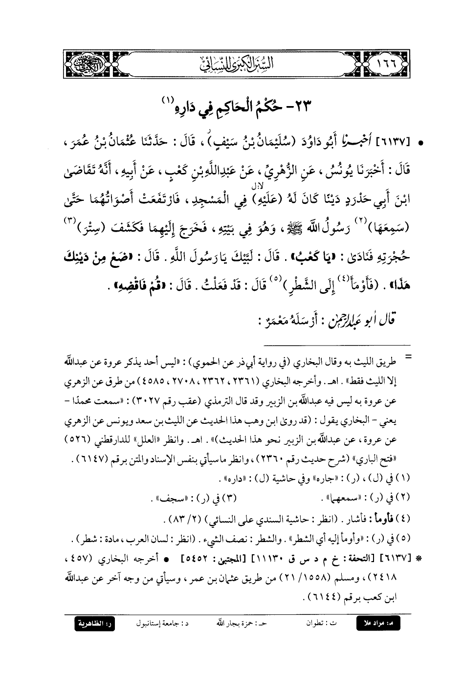 6137- أَخبَرنا أَبو دَاوُدَ سُلَيمَانُ بنُ سَيْفٍ، قَالَ: حَدثنا عُثْمَانُ بنُ عُمَرَ، قَالَ: أَخبَرنا يُونُسُ، عَنِ الزُّهْرِيِّ، عَن عَبدِ اللهِ بنِ كَعْبٍ، عَن أَبيهِ، أَنَّهُ تَقَاضَى ابنَ أَبي حَدْرَدٍ دَيْنًا كَانَ لَهُ عَلَيْهِ فِي المَسْجِدِ، فَارْتَفَعَتْ أَصْوَاتُهُمَا حَتَّى سَمِعَهُمَا رَسُولُ اللهِ صَلى الله عَليه وسَلم وَهُوَ فِي بَيْتِهِ، فَخَرَجَ إِلَيْهِمَا فَكَشَفَ سِتْرَ حُجْرَتِهِ فَنَادَى: يَا كَعْبُ، قَالَ: لَبَّيْكَ يَا رَسُولَ اللهِ، قَالَ: ضَعْ مِنْ دَيْنِكَ هَذَا، وَأَوْمَأَ إِلَى الشَّطْرِ، قَالَ: قَدْ فَعَلْتُ، قَالَ: قُمْ فَاقْضِهِ.
