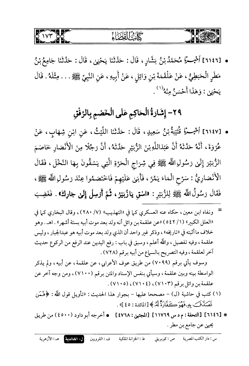 6147- أَخبَرنا قُتَيبَةُ بنُ سَعِيدٍ، قَالَ: حَدثنا اللَّيْثُ، عَنِ ابنِ شِهَابٍ، عَن عُرْوَةَ، أَنَّهُ حَدَّثَهُ أَنَّ عَبدَ اللهِ بْنَ الزُّبَيْرِ حَدَّثَهُ، أَنَّ رَجُلاً مِنَ الأَنْصَارِ خَاصَمَ الزُّبَيْرَ إِلَى رَسُولِ اللهِ صَلى الله عَليه وسَلم فِي شِرَاجِ الحَرَّةِ الَّتِي يَسْقُونَ بِهَا النَّخْلَ، فَقَالَ الأَنْصَارِيُّ: سَرِّحِ المَاءَ يَمُرُّ، فَأَبَى عَلَيْهِ، فَاخْتَصَمُوا عِنْدَ رَسُولِ اللهِ صَلى الله عَليه وسَلم، فَقَالَ رَسُولُ اللهِ صَلى الله عَليه وسَلم لِلزُّبَيْرِ: اسْقِ يَا زُبَيْرُ، ثُمَّ أَرْسِلْ إِلَى جَارِكَ، فَغَضِبَ الأَنْصَارِيُّ، فَقَالَ: يَا رَسُولَ اللهِ، أَنْ كَانَ ابنَ عَمَّتِكَ، فَتَلَوَّنَ وَجْهُ رَسُولِ اللهِ صَلى الله عَليه وسَلم، وقَالَ: يَا زُبَيْرُ اسْقِ، ثُمَّ احْبِسِ المَاءَ حَتَّى يَرْجِعَ إِلَى الجَدْرِ، فَقَالَ الزُّبَيْرُ: وَاللهِ إِنِّي لأَحْسَبُ هَذِهِ الآيَةَ أُنْزِلَتْ فِي ذَلِكَ: {فَلا وَرَبِّكَ لا يُؤْمِنُونَ}.