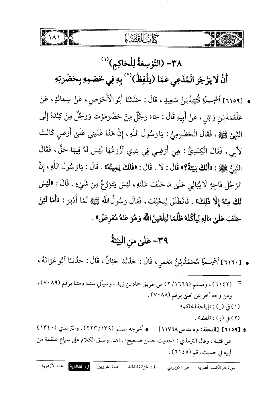 6159- أَخبَرنا قُتَيبَةُ، قَالَ: حَدثنا أَبو الأَحْوَصِ، عَن سِمَاكٍ، عَن عَلْقَمَةَ بنِ وَائِلٍ، عَن أَبيهِ، قَالَ: جَاءَ رَجُلٌ مِنْ حَضْرَمَوْتَ، وَرَجُلٌ مِنْ كِنْدَةَ إِلَى النَّبيِّ صَلى الله عَليه وسَلم، فَقَالَ الحَضْرَمِيُّ: يَا رَسُولَ اللهِ، إِنَّ هَذَا غَلَبَنِي عَلَى أَرْضٍ كَانَتْ لأَبي، فَقَالَ الكِنْدِيُّ: هِيَ أَرْضِي فِي يَدِي أَزْرَعُهَا لَيْسَ لَهُ فِيهَا حَقٌّ، فَقَالَ النَّبيُّ صَلى الله عَليه وسَلم: أَلَكَ بَيِّنَةٌ؟ قَالَ: لا، قَالَ: فلكَ يَمِينُهُ، قَالَ: يَا رَسُولَ اللهِ، إِنَّ الرَّجُلَ فَاجِرٌ لا يُبَالِي عَلَى مَا حَلَفَ عَلَيْهِ، لَيْسَ يَتَوَرَّعُ مِنْ شَيْءٍ، قَالَ: لَيْسَ لَكَ مِنْهُ إِلاَّ ذَلِكَ، فَانْطَلَقَ لِيَحْلِفَ، فَقَالَ رَسُولُ اللهِ صَلى الله عَليه وسَلم لَمَّا أَدْبَرَ: أَمَا لئنْ حَلَفَ عَلَى مَالِهِ لِيَأْكُلَهُ ظُلْمًا، لَيَلْقَيَنَّ اللهَ وَهُوَ عَنهُ مُعْرِضٌ.