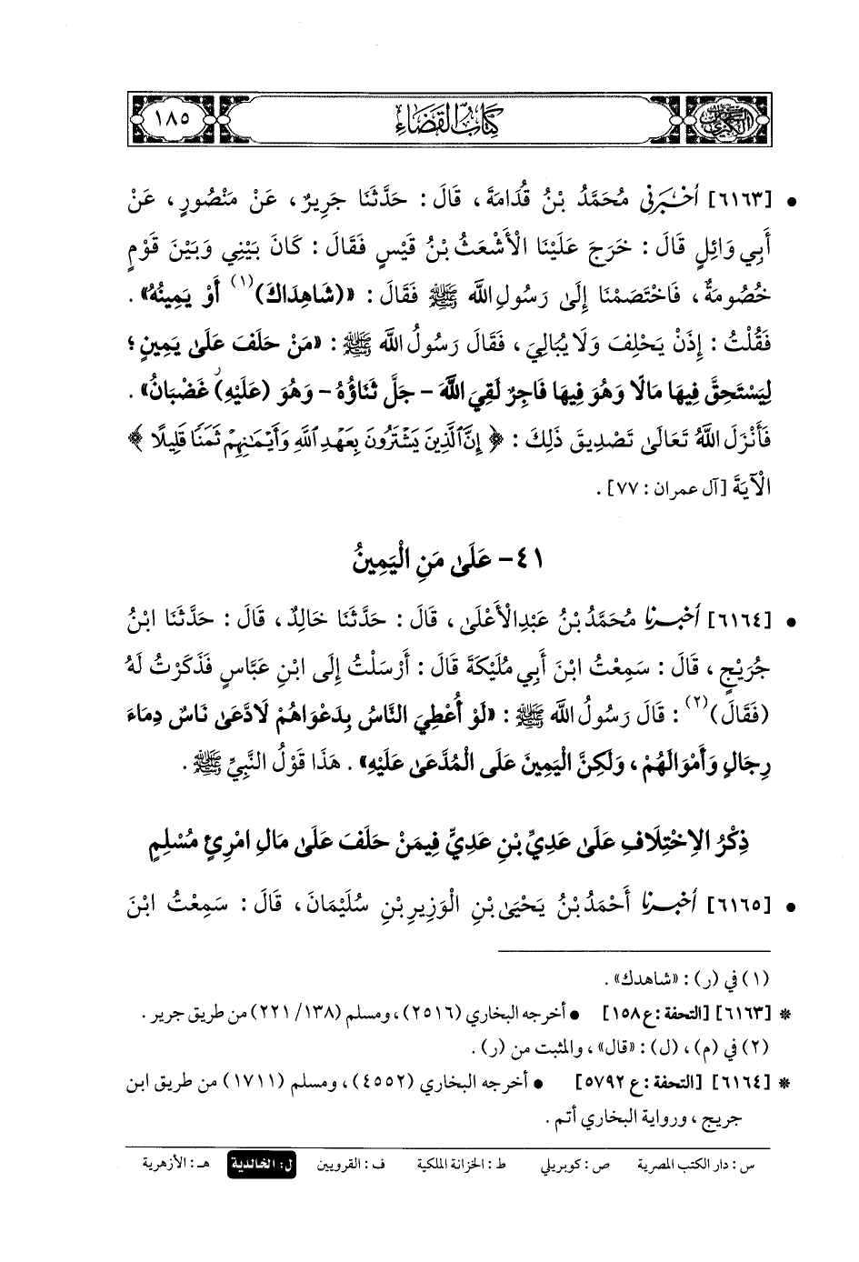 6163- أَخبَرني مُحَمدُ بنُ قُدَامَةَ، قَالَ: حَدثنا جَرِيرٌ، عَن مَنصُورٍ، عَن أَبي وَائِلٍ، قَالَ: خَرَجَ عَلَيْنَا الأَشْعَثُ بنُ قَيسٍ، فقَالَ: كَانَ بَيْنِي وَبَيْنَ قَوْمٍ خُصُومَةٌ، فَاخْتَصَمْنَا إِلَى رَسُولِ اللهِ صَلى الله عَليه وسَلم، فَقَالَ: شَاهِدَاكَ أَوْ يَمِينُهُ، فَقُلْتُ: إِذًا يَحْلِفُ وَلا يُبَالِي، فَقَالَ رَسُولُ اللهِ صَلى الله عَليه وسَلم: مَنْ حَلَفَ عَلَى يَمِينٍ لِيَسْتَحِقَّ فِيهَا مَالاً وَهُوَ فِيهَا فَاجِرٌ، لَقِيَ اللهَ جل ثناؤه وَهُوَ عَلَيْهِ غَضْبَانُ، فَأَنْزَلَ اللهُ تَعَالَى تَصْدِيقَ ذَلِكَ: {إِنَّ الَّذِينَ يَشْتَرُونَ بِعَهْدِ اللهِ وَأَيْمَانِهِمْ ثَمَنًا قَلِيلاً...} الآيَةَ.