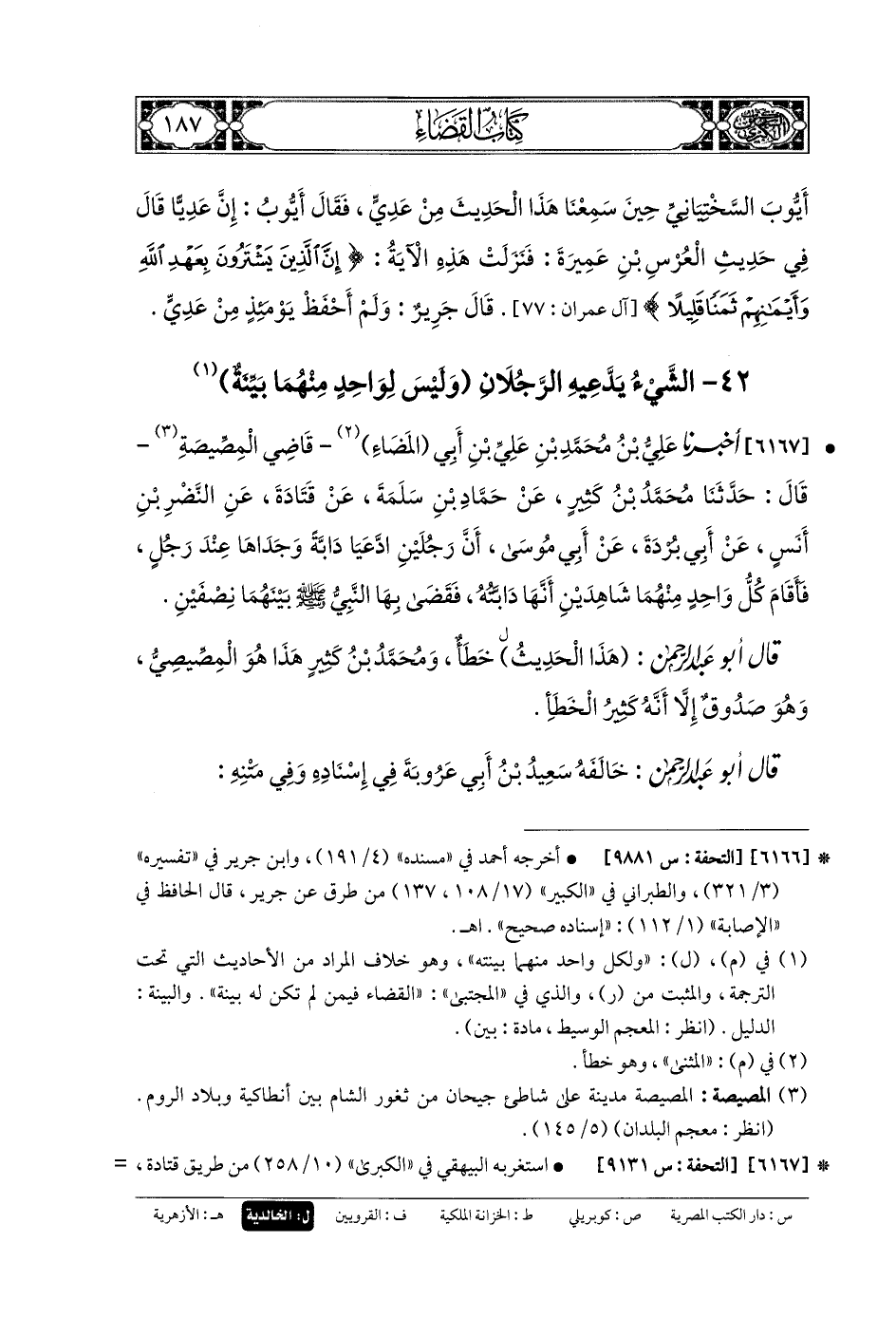 6167- أَخبَرنا عَليُّ بنُ مُحَمدِ بنِ عَليِّ بنِ أَبي المَضَاءَ (1)، قَاضِي المَصِّيصَةِ، قَالَ: حَدثنا مُحَمدُ بنُ كَثِيرٍ، عَن حَمَّادِ بنِ سَلَمَةَ، عَن قَتَادَةَ، عَنِ النَّضْرِ بنِ أَنَسٍ، عَن أَبي بُرْدَةَ، عَن أَبي مُوسَى، أَنَّ رَجُلَيْنِ ادَّعَيَا دَابَّةً وَجَدَاهَا عِنْدَ رَجُلٍ، فَأَقَامَ كُلُّ وَاحِدٍ مِنْهُمَا شَاهِدَيْنِ أَنَّهَا دَابَّتُهُ، فَقَضَى بِهَا النَّبيُّ صَلى الله عَليه وسَلم بَيْنَهُمَا نِصْفَيْنِ.