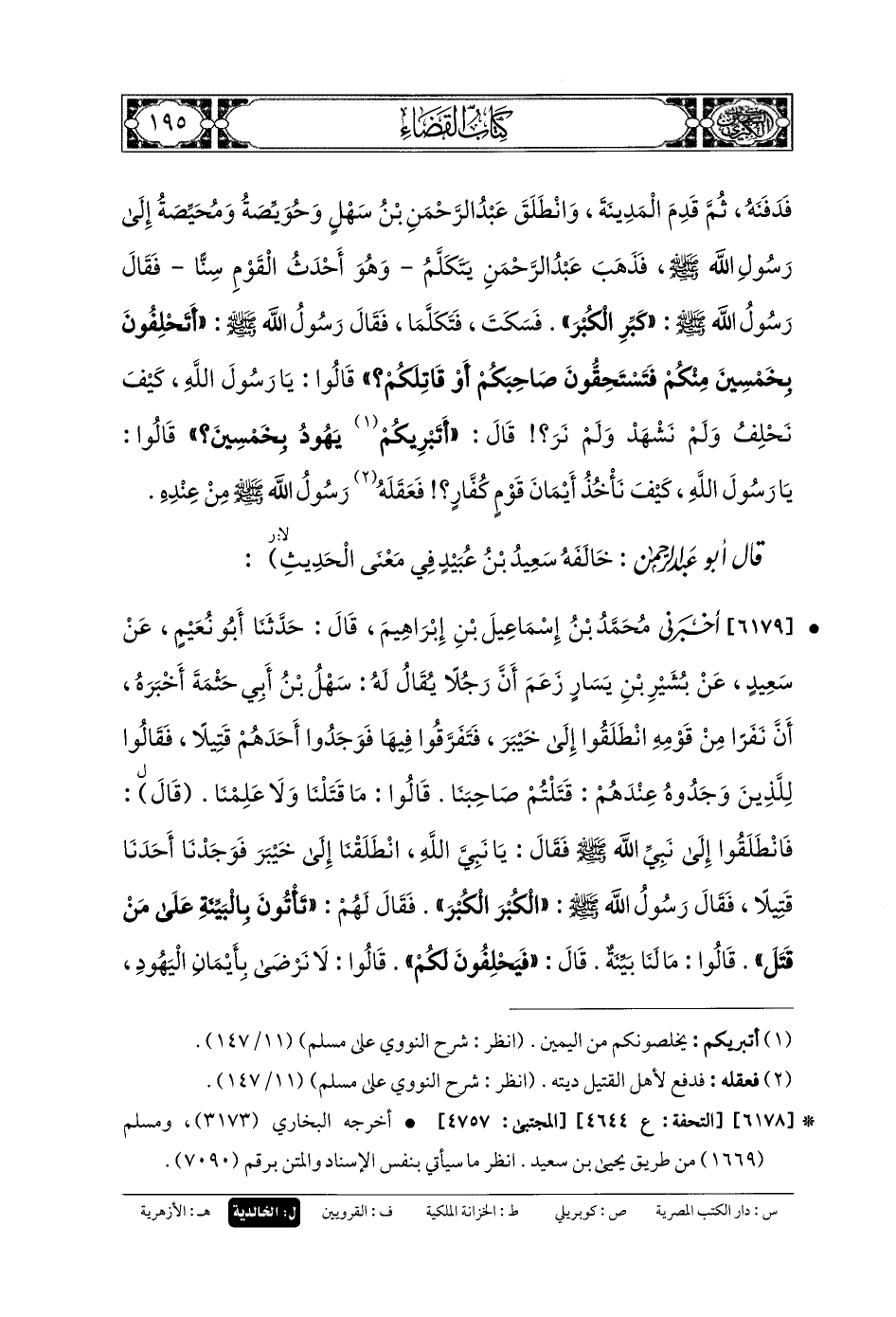 6179- أَخبَرني مُحَمدُ بنُ إِسمَاعِيلَ بنِ إِبرَاهِيمَ، قَالَ: حَدثنا أَبو نُعَيْمٍ، عَن سَعِيدٍ، عَن بُشَيْرِ بنِ يَسَارٍ، زَعَمَ أَنَّ رَجُلاً يُقَالُ لَهُ: سَهْلُ بنُ أَبي حَثْمَةَ أَخْبَرَهُ؛ أَنَّ نَفَرًا مِنْ قَوْمِهِ انْطَلَقُوا إِلَى خَيْبَرَ، فَتَفَرَّقُوا فِيهَا، فَوَجَدُوا أَحَدَهُمْ قَتِيلاً، فَقَالُوا لِلَّذِينَ وَجَدُوهُ عِنْدَهُمْ: قَتَلْتُمْ صَاحِبَنَا؟ قَالُوا: مَا قَتَلْنَا وَلا عَلِمْنَا، قال: فَانْطَلَقُوا إِلَى نَبِيِّ اللهِ صَلى الله عَليه وسَلم، فَقَالُوا (1): يَا نَبِيَّ اللهِ، انْطَلَقْنَا إِلَى خَيْبَرَ، فَوَجَدْنَا أَحَدَنَا قَتِيلاً، فَقَالَ رَسُولُ اللهِ صَلى الله عَليه وسَلم: الكُبْرَ الكُبْرَ، فَقَالَ لَهُمْ: تَأْتُونَ بِالبَيِّنَةِ عَلَى مَنْ قَتَلَ، قَالُوا: مَا لَنَا بَيِّنَةٌ، قَالَ: فَيَحْلِفُونَ لَكُمْ، قَالُوا: لا نَرْضَى بِأَيْمَانِ اليَهُودِ، فَكَرِهَ رَسُولُ اللهِ صَلى الله عَليه وسَلم أَنْ يَبْطُلَ دَمَهُ، فَوَدَاهُ مِئَةً مِنْ إِبِلِ الصَّدَقَةِ.