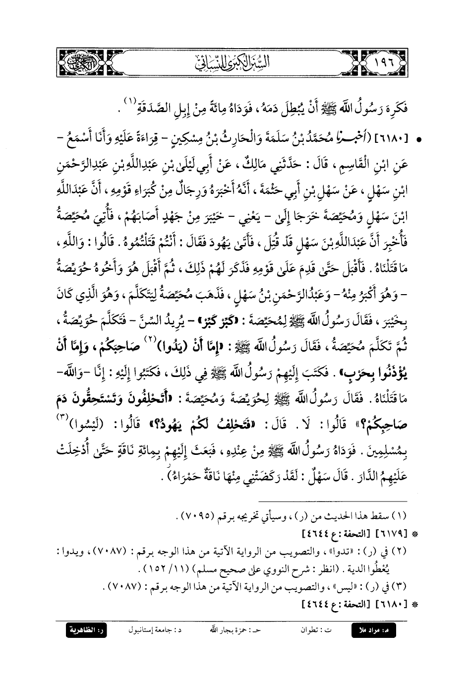 6180- أَخبَرنا مُحَمدُ بنُ سَلَمَةَ، وَالحَارِثُ بنُ مِسْكِينٍ، قِرَاءَةً عَلَيْهِ، وَأَنَا أَسْمَعُ، عَنِ ابنِ القَاسِمِ، قَالَ: حَدَّثني مَالِكٌ، عَن أَبي لَيْلَى بنِ عَبدِ اللهِ بنِ عَبدِ الرَّحمَنِ بنِ سَهلٍ، عَن سَهْلِ بنِ أَبي حَثْمَةَ، أَنَّهُ أَخْبَرَهُ وَرِجَالٌ مِنْ كُبَرَاءِ قَوْمِهِ، أَنَّ عَبدَ اللهِ بْنَ سَهْلٍ، وَمُحَيِّصَةَ خَرَجَا إِلَى، يَعْنِي خَيْبَرَ، مِنْ جَهْدٍ أَصَابَهُمْ، فَأُتِي مُحَيِّصَةُ، فَأَخْبَرَ أَنَّ عَبدَ اللهِ بْنَ سَهْلٍ قَدْ قُتِلَ، فَأَتَى يَهُودَ، فَقَالَ: أَنْتُمْ قَتَلْتُمُوهُ؟ قَالُوا: وَاللهِ مَا قَتَلْنَاهُ، فأَقْبَلَ حتى قَدِمَ عَلَى قَوْمِهِ، فَذَكَرَ لهم ذَلِكَ، ثُمَّ أَقْبَلَ هُوَ وَأَخُوهُ حُوَيِّصَةُ، وَهُوَ أَكْبَرُ مِنْهُ، وَعَبدُ الرَّحمَنِ بنُ سَهْلٍ، فَذَهَبَ مُحَيِّصَةُ لِيَتَكَلَّمَ، وَهُوَ الَّذِي كَانَ بِخَيْبَرَ، فَقَالَ رَسُولُ اللهِ صَلى الله عَليه وسَلم لِمُحَيِّصَةَ: كَبِّرْ كَبِّرْ، يُرِيدُ السِّنَّ، فتَكَلَّمَ حُوَيِّصَةُ، ثُمَّ تَكَلَّمَ مُحَيِّصَةُ، فَقَالَ رَسُولُ اللهِ صَلى الله عَليه وسَلم: إِمَّا أَنْ يدُوا صَاحِبَكُمْ وَإِمَّا أَنْ يُؤْذَنُوا بِحَرْبٍ، فكَتَبَ إِلَيْهِمْ رَسُولُ اللهِ صَلى الله عَليه وسَلم في ذَلِكَ، فَكَتَبُوا إليه: إنا وَاللهِ مَا قَتَلْنَاهُ، فَقَالَ رَسُولُ اللهِ صَلى الله عَليه وسَلم: لِحُوَيِّصَةَ وَمُحَيِّصَةَ: أتَحْلِفُونَ وَتَسْتَحِقُّونَ دَمَ صَاحِبِكُمْ؟ قَالُوا: لا، قَالَ: فَتَحْلِفُ لَكُمْ يَهُودُ، قَالُوا: لَيْسُوا بمُسْلِمِينَ، فَوَدَاهُ رَسُولُ اللهِ صَلى الله عَليه وسَلم مِنْ عِنْدِهِ، فَبَعَثَ إِلَيْهِمْ بِمئَةِ نَاقَةٍ، حَتَّى أُدْخِلَتْ عَلَيْهِمُ الدَّارَ، قَالَ سَهْلٌ: لَقَدْ رَكَضَتْنِي مِنْهَا نَاقَةٌ حَمْرَاءُ.