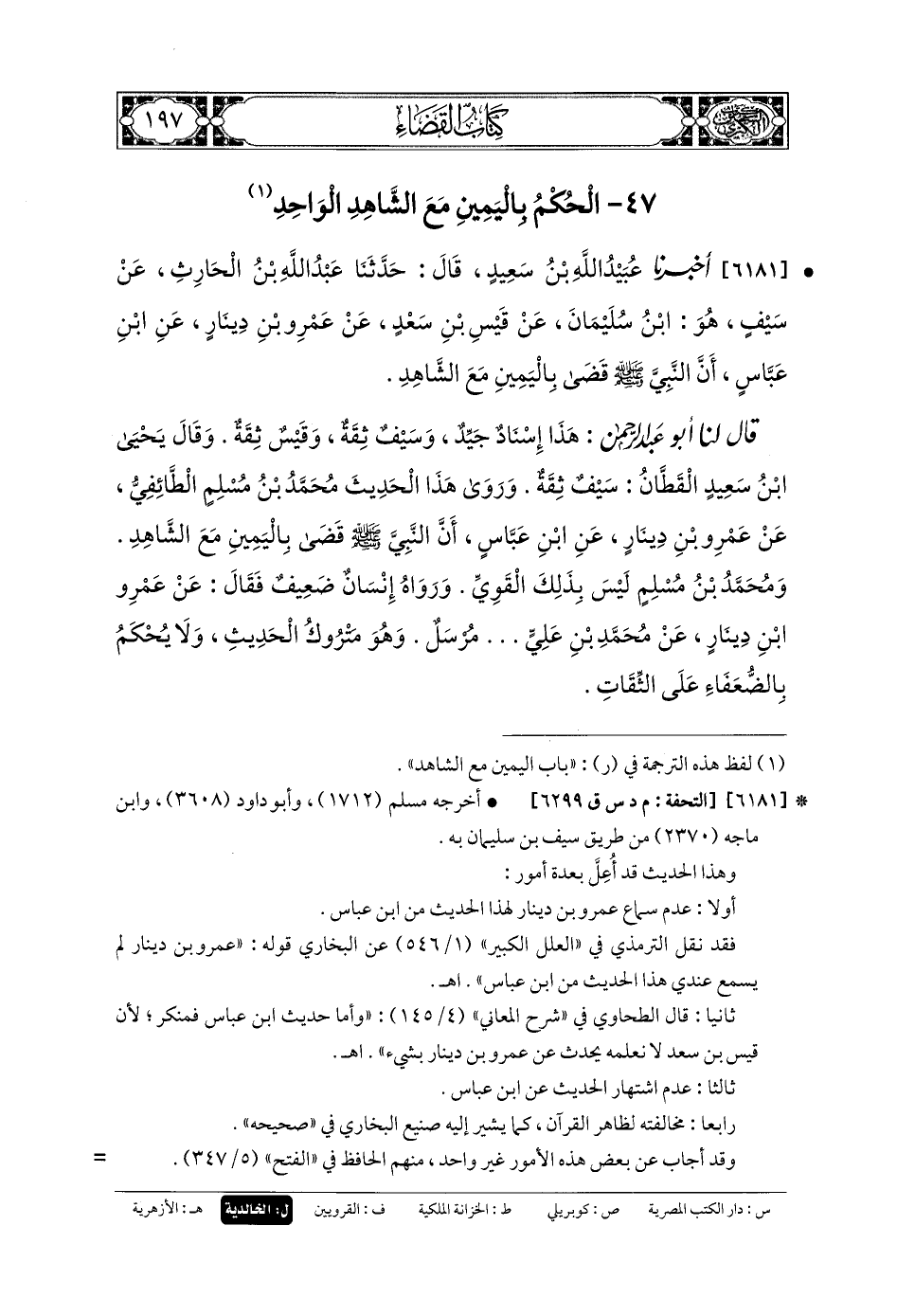 47- الحُكْمُ بِاليَمِينِ مَعَ الشَّاهِدِ الوَاحِدِ.
