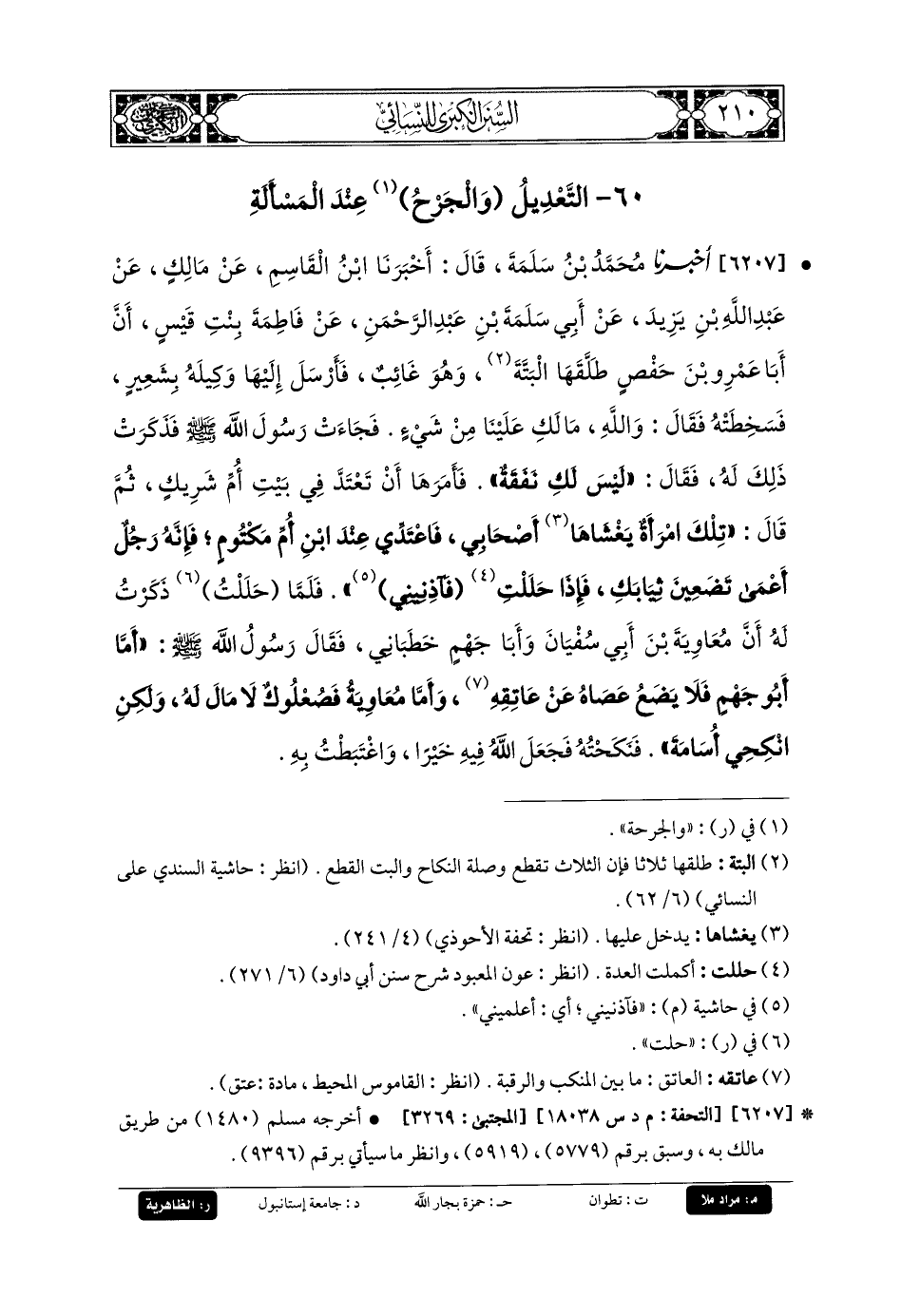 6207- أَخبَرنا مُحَمدُ بنُ سَلَمَةَ، قَالَ: أَخبَرنا ابنُ القَاسِمِ، عَن مَالِكٍ، عَن عَبدِ اللهِ بنِ يَزِيدَ، عَن أَبي سَلَمَةَ بنِ عَبدِ الرَّحمَنِ، عَن فَاطِمَةَ بِنْتِ قَيسٍ، أَنَّ أَبَا عَمْرِو بنِ حَفْصٍ طَلَّقَهَا البَتَّةَ وَهُوَ غَائِبٌ، فَأَرْسَلَ إِلَيْهَا وَكِيلَهُ بِشَعِيرٍ، فَتَسَخَّطَتْهُ، فَقَالَ: وَاللهِ مَا لَكِ عَلَيْنَا مِنْ شَيْءٍ، فَجَاءَتْ رَسُولَ اللهِ صَلى الله عَليه وسَلم فَذَكَرَتْ ذَلِكَ لَهُ، فَقَالَ: لَيْسَ لَكِ نَفَقَةٌ، فَأَمَرَهَا أَنْ تَعْتَدَّ فِي بَيْتِ أُمِّ شَرِيكٍ، ثُمَّ قَالَ: تِلْكَ امْرَأَةٌ يَغْشَاهَا أَصْحَابِي، فَاعْتَدِّي عِنْدَ ابنِ أُمِّ مَكْتُومٍ، فَإِنَّهُ رَجُلٌ أَعْمَى تَضَعِينَ ثِيَابَكِ، فَإِذَا حَلَلْتِ فَآذِنِينِي، فَلَمَّا حَلَلْتُ ذَكَرْتُ لَهُ أَنَّ مُعاويَةَ بْنَ أَبي سُفيانَ، وَأَبَا جَهْمٍ خَطَبَانِي، فَقَالَ رَسُولُ اللهِ صَلى الله عَليه وسَلم: أَمَّا أَبو جَهْمٍ، فَلا يَضَعُ عَصَاهُ عَن عَاتِقِهِ، وَأَمَّا مُعاويَةُ فَصُعْلُوكٌ لا مَالَ لَهُ، وَلَكِنِ انْكِحِي أُسَامَةَ، فَنَكَحْتُهُ، فَجَعَلَ اللهُ فِيهِ خَيْرًا، وَاغْتَبَطْتُ بِهِ.