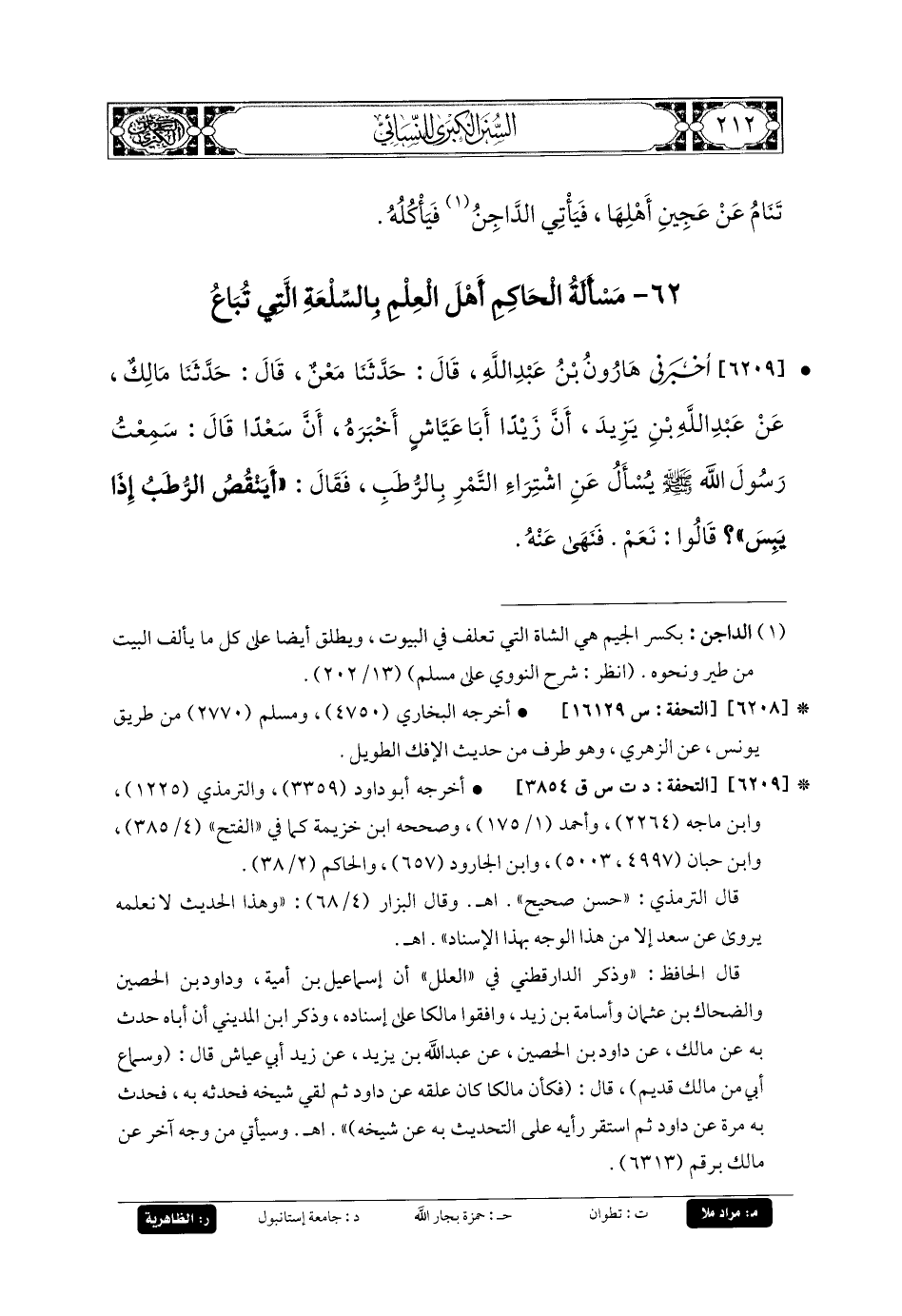 6209- أَخبَرني هَارُونُ بنُ عَبدِ اللهِ، قَالَ: حَدثنا مَعْنٌ، قَالَ: حَدثنا مَالِكٌ، عَن عَبدِ اللهِ بنِ يَزِيدَ، أَنَّ زَيْدًا أَبَا عَيَّاشٍ أَخْبَرَهُ؛ أَنَّ سَعْدًا قَالَ: سَمِعْتُ رَسُولَ اللهِ صَلى الله عَليه وسَلم يُسْأَلُ عَنِ اشْتِرَاءِ التَّمْرِ بِالرُّطَبِ، قَالَ: أَيَنْقُصُ الرُّطَبُ إِذَا يَبِسَ؟ قَالُوا: نَعَمْ، فَنَهَى عَنهُ.