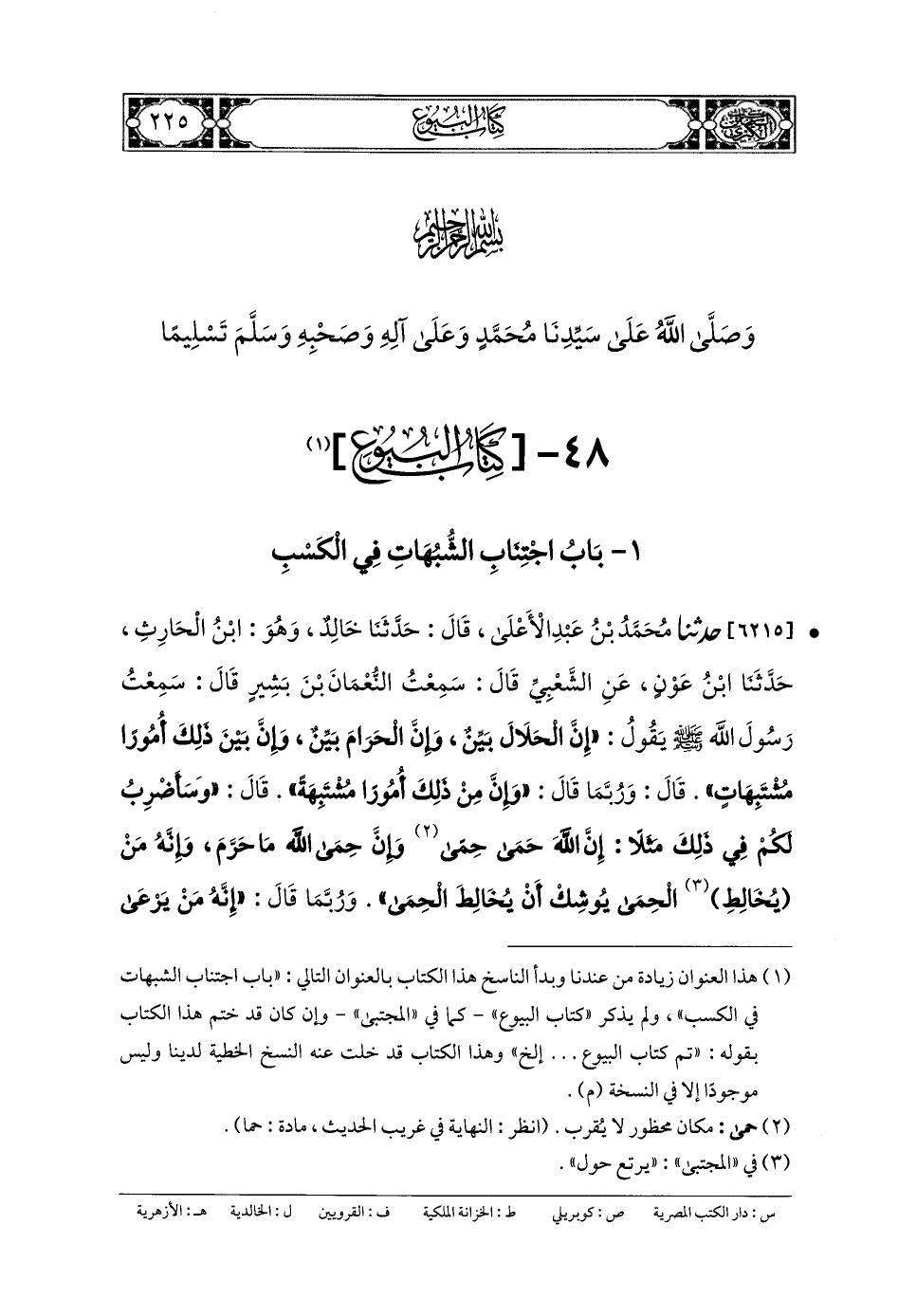 6215 - حَدثنا مُحَمدُ بنُ عَبدِ الأَعْلَى، قَالَ: حَدثنا خَالِدٌ، وَهُوَ ابنُ الحَارِثِ، قَالَ حَدثنا ابنُ عَوْنٍ، عَنِ الشَّعْبِيِّ، قَالَ: سَمِعْتُ النُّعْمَانَ بْنَ بَشِيرٍ، قَالَ: سَمِعْتُ رَسُولَ اللهِ صَلى الله عَليه وسَلم يَقُولُ: إِنَّ الحَلالَ بَيِّنٌ، وَإِنَّ الحَرَامَ بَيِّنٌ، وَإِنَّ بَيْنَ ذَلِكَ أُمُورًا مُشْتَبِهَاتٍ، قَالَ: وَرُبَّمَا قَالَ: وَإِنَّ مِنْ ذَلِكَ أُمُورًا مُشْتَبِهَةً، وَسَأَضْرِبُ لَكُمْ فِي ذَلِكَ مَثَلاً، إِنَّ اللهَ حَمَى حِمًى، وَإِنَّ حِمَى اللهِ مَا حَرَّمَ، وَإِنَّهُ مَنْ يَرْتَعْ حَوْلَ الحِمَى (1) يُوشِكُ أَنْ يُخَالِطَ الحِمَى، وَرُبَّمَا قَالَ: إِنَّهُ مَنْ يَرْعَى حَوْلَ الحِمَى يُوشِكُ أَنْ يَرْتَعَ فِيهِ، وَإِنَّ مَنْ يُخَالِطُ الرِّيبَةَ يُوشِكُ أَنْ يَجْسُرَ.