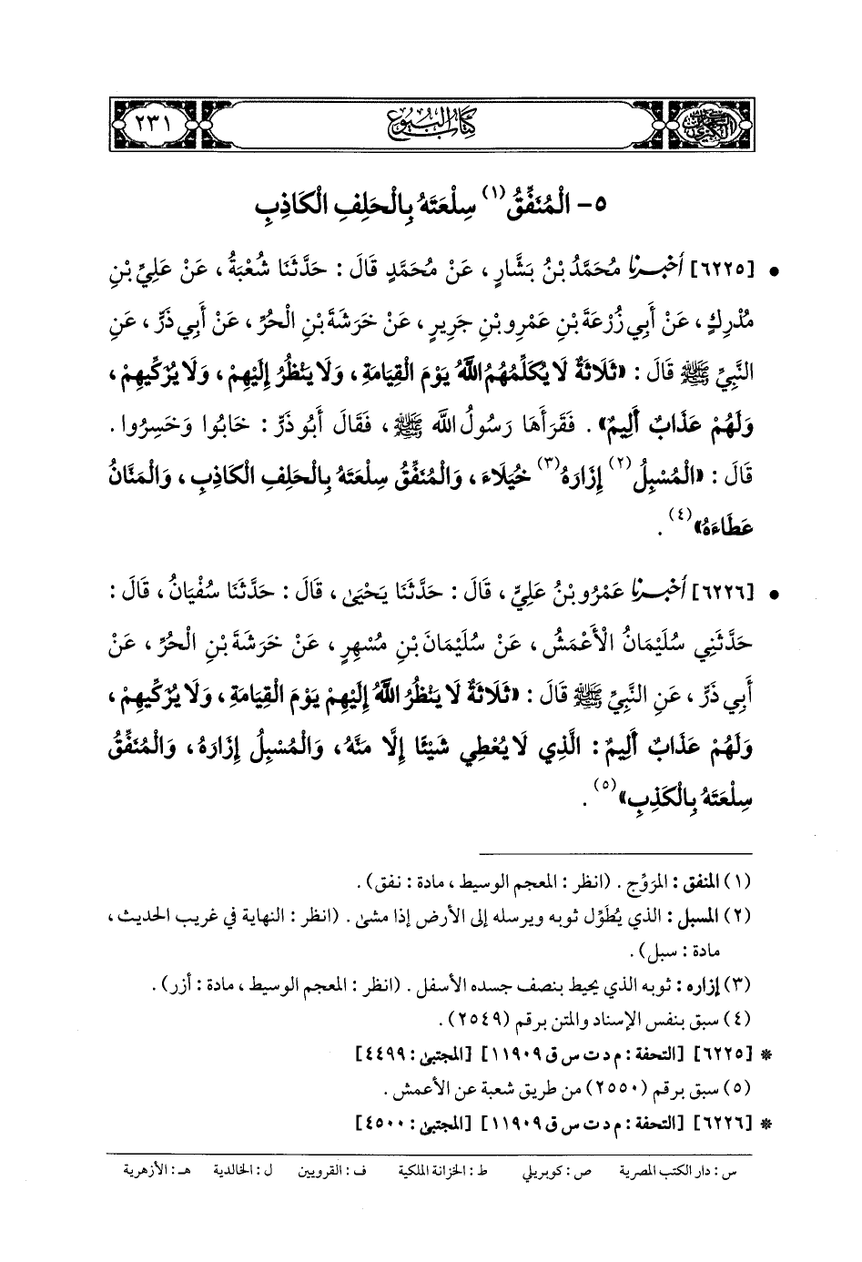 6226- أَخبَرنا عَمْرُو بنُ عَليٍّ، قَالَ: حَدثنا يَحيَى، قَالَ: حَدثنا سُفيانُ، قَالَ: حَدَّثني سُلَيمَانُ الأَعْمَشُ، عَن سُلَيمَانَ بنِ مُسْهِرٍ، عَن خَرَشَةَ بنِ الحُرِّ، عَن أَبي ذَرٍّ، عَنِ النَّبيِّ صَلى الله عَليه وسَلم قَالَ: ثَلاثَةٌ لا يَنْظُرُ اللهُ إِلَيْهِمْ يَوْمَ القِيَامَةِ، وَلا يُزَكِّيهِمْ، وَلَهُمْ عَذَابٌ أَلِيمٌ: الَّذِي لا يُعْطِي شَيْئًا إِلاَّ مَنَّهُ، وَالمُسْبِلُ إِزَارَهُ، وَالمُنَفِّقُ سِلْعَتَهُ بِالكَذِبِ.