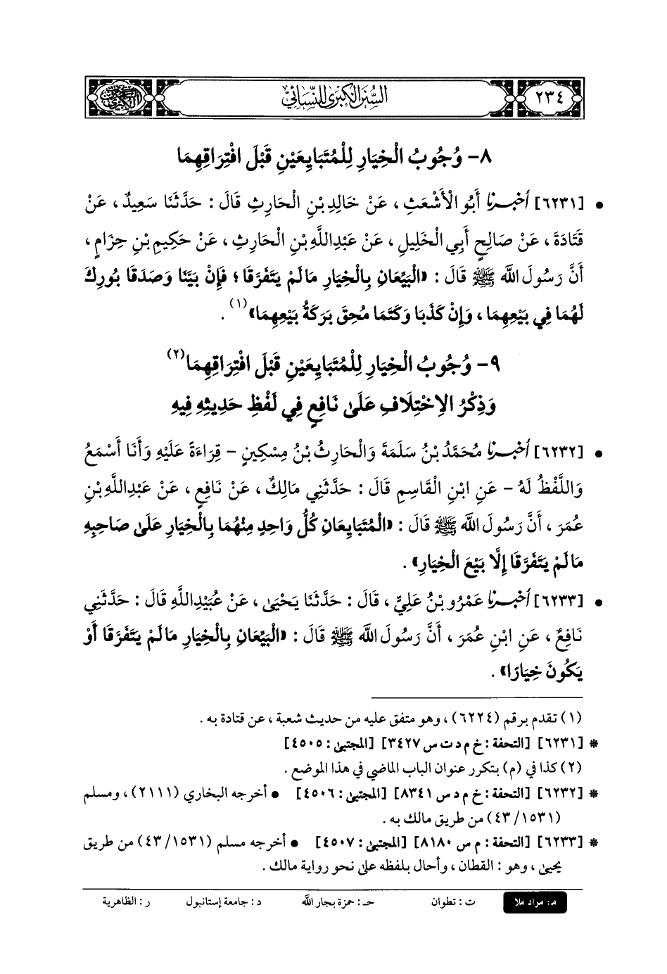 6231- أَخبَرنا أَبو الأَشْعَثِ، عَن خَالِدِ بنِ الحَارِثِ، قَالَ: حَدثنا سَعِيدٌ، عَن قَتَادَةَ، عَن صَالِحٍ أَبي الخَلِيلِ، عَن عَبدِ اللهِ بنِ الحَارِثِ، عَن حَكِيمِ بنِ حِزَامٍ، أَنَّ رَسُولَ اللهِ صَلى الله عَليه وسَلم قَالَ: البَيِّعَانِ بِالخِيَارِ مَا لَمْ يَتَفَرَّقَا، فَإِنْ بَيَّنَا وَصَدَقَا بُورِكَ لَهُمَا فِي بَيْعِهِمَا، وَإِنْ كَذَبَا وَكَتَمَا مُحِقَ بَرَكَةُ بَيْعِهِمَا.