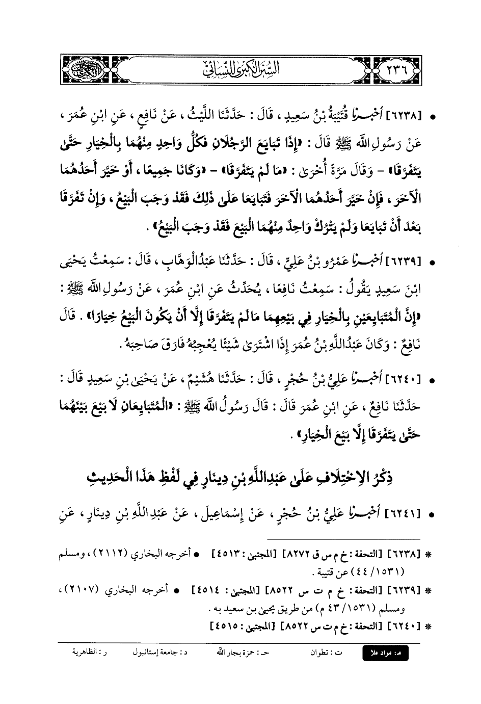 6239- أَخبَرنا عَمْرُو بنُ عَليٍّ، قَالَ: حَدثنا عَبدُ الوَهَّابِ، قَالَ: سَمِعْتُ يَحيَى بْنَ سَعِيدٍ يَقُولُ: سَمِعْتُ نَافِعًا يُحَدِّثُ عَنِ ابنِ عُمَرَ، عَن رَسُولِ اللهِ صَلى الله عَليه وسَلم، إنَّ المُتَبَايِعَيْنِ بِالخِيَارِ فِي بَيْعِهِمَا مَا لَمْ يَفْتَرِقَا، إِلاَّ أَنْ يَكُونَ البَيْعُ خِيَارًا، قَالَ نَافِعٌ: وَكَانَ عَبدُ اللهِ بنُ عُمَرَ إِذَا اشْتَرَى شَيْئًا يُعْجِبُهُ فَارَقَ صَاحِبَهُ.