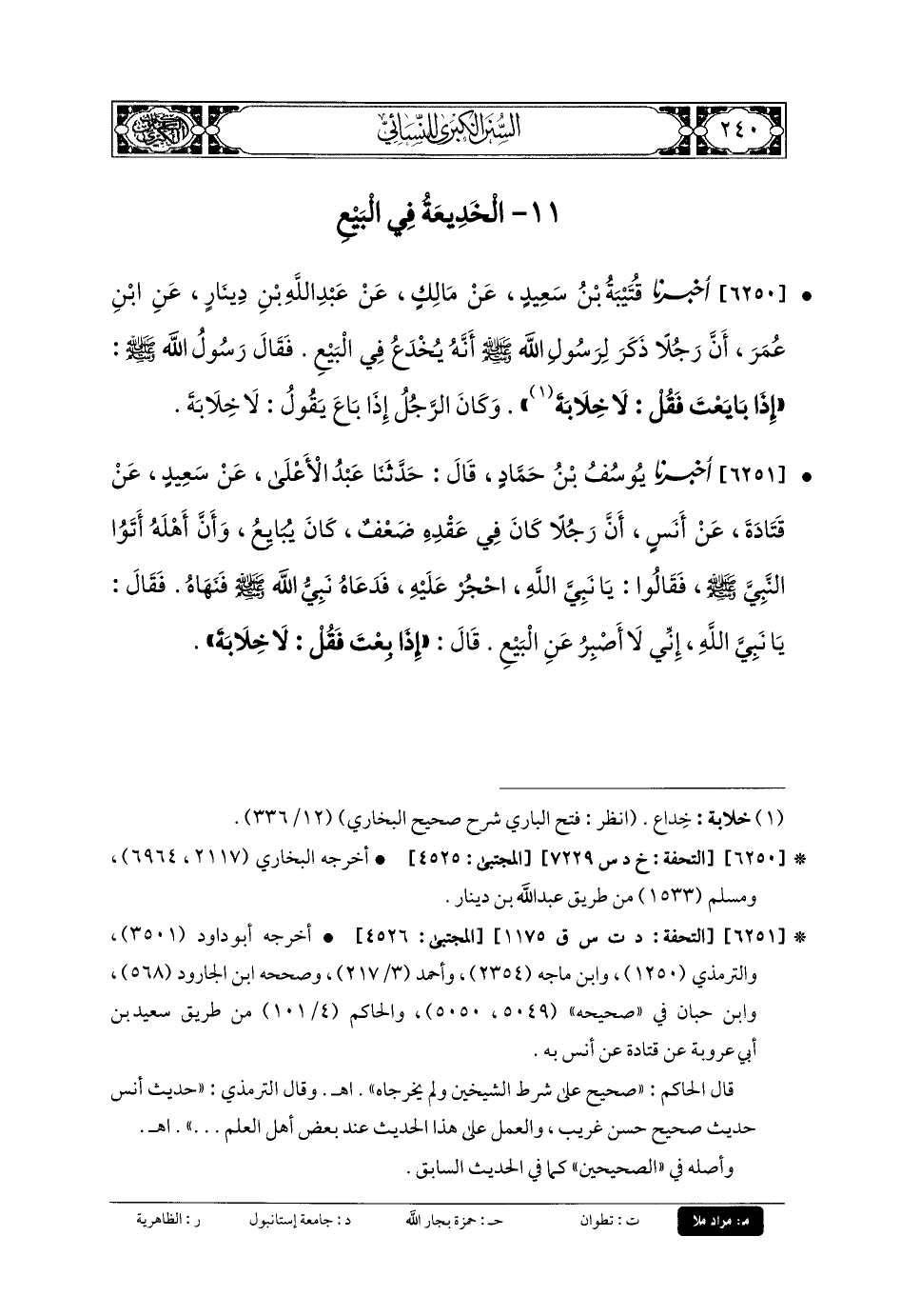 6250- أَخبَرنا قُتَيبَةُ بنُ سَعِيدٍ، عَن مَالِكٍ، عَن عَبدِ اللهِ بنِ دِينَارٍ، عَنِ ابنِ عُمَرَ، أَنَّ رَجُلاً ذَكَرَ لِرَسُولِ اللهِ صَلى الله عَليه وسَلم أَنَّهُ يُخْدَعُ فِي البَيْعِ، فَقَالَ لَهُ رَسُولُ اللهِ صَلى الله عَليه وسَلم: إِذَا بَايَعْتَ فَقُلْ: لا خِلابَةَ، وَكَانَ الرَّجُلُ إِذَا بَاعَ يَقُولُ: لا خِلابَةَ.