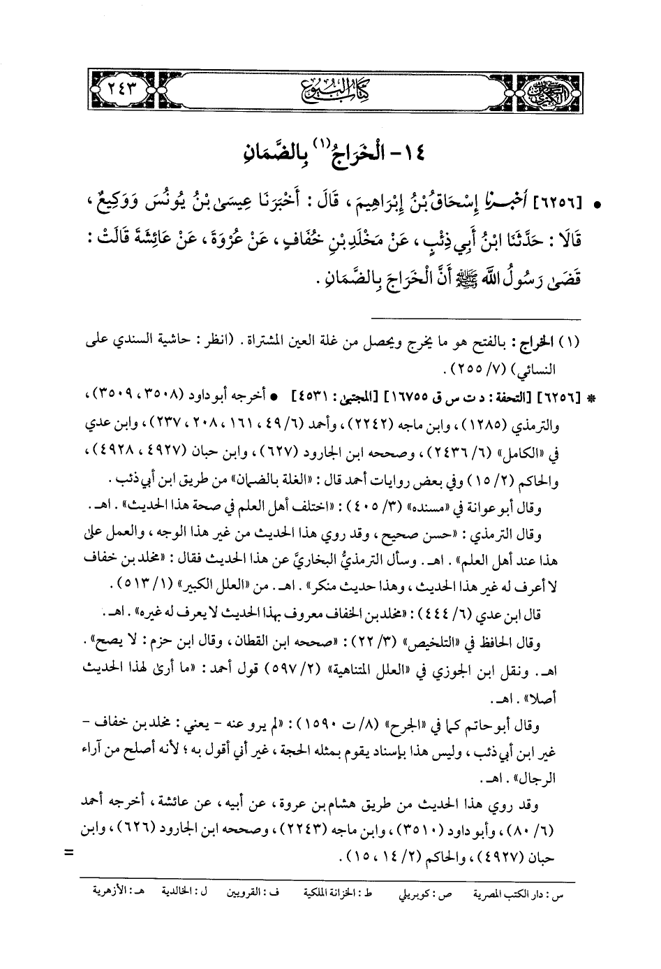 6256- أَخبَرنا إِسحَاقُ بنُ إِبرَاهِيمَ، قَالَ: أَخبَرنا عِيسَى بنُ يُونُسَ، وَوَكِيعٌ، قَالا: حَدثنا ابنُ أَبي ذِئْبٍ، عَن مَخْلَدِ بنِ خُفَافٍ، عَن عُرْوَةَ، عَن عَائِشَةَ، قَالَتْ: قَضَى رَسُولُ اللهِ صَلى الله عَليه وسَلم أَنَّ الخَرَاجَ بِالضَّمَانِ.