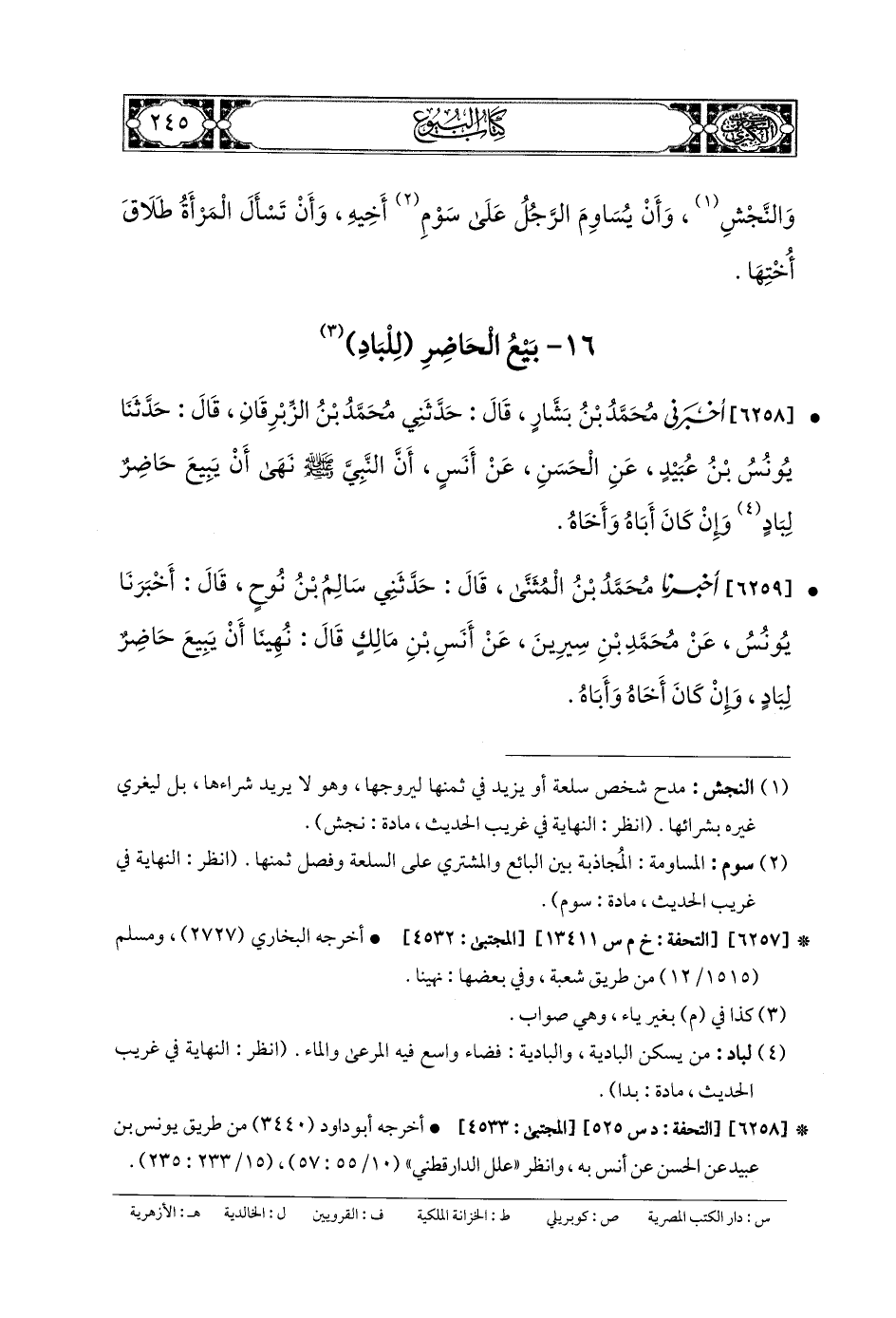 6258- أَخبَرنا مُحَمدُ بنُ بَشَّارٍ، قَالَ: حَدَّثني مُحَمدُ بنُ الزِّبْرِقَانِ، قَالَ: حَدثنا يُونُسُ بنُ عُبَيدٍ، عَنِ الحَسَنِ، عَن أَنَسٍ، أَنَّ النَّبيَّ صَلى الله عَليه وسَلم نَهَى أَنْ يَبِيعَ حَاضِرٌ لِبَادٍ، وَإِنْ كَانَ أَبَاهُ وَأَخَاهُ.