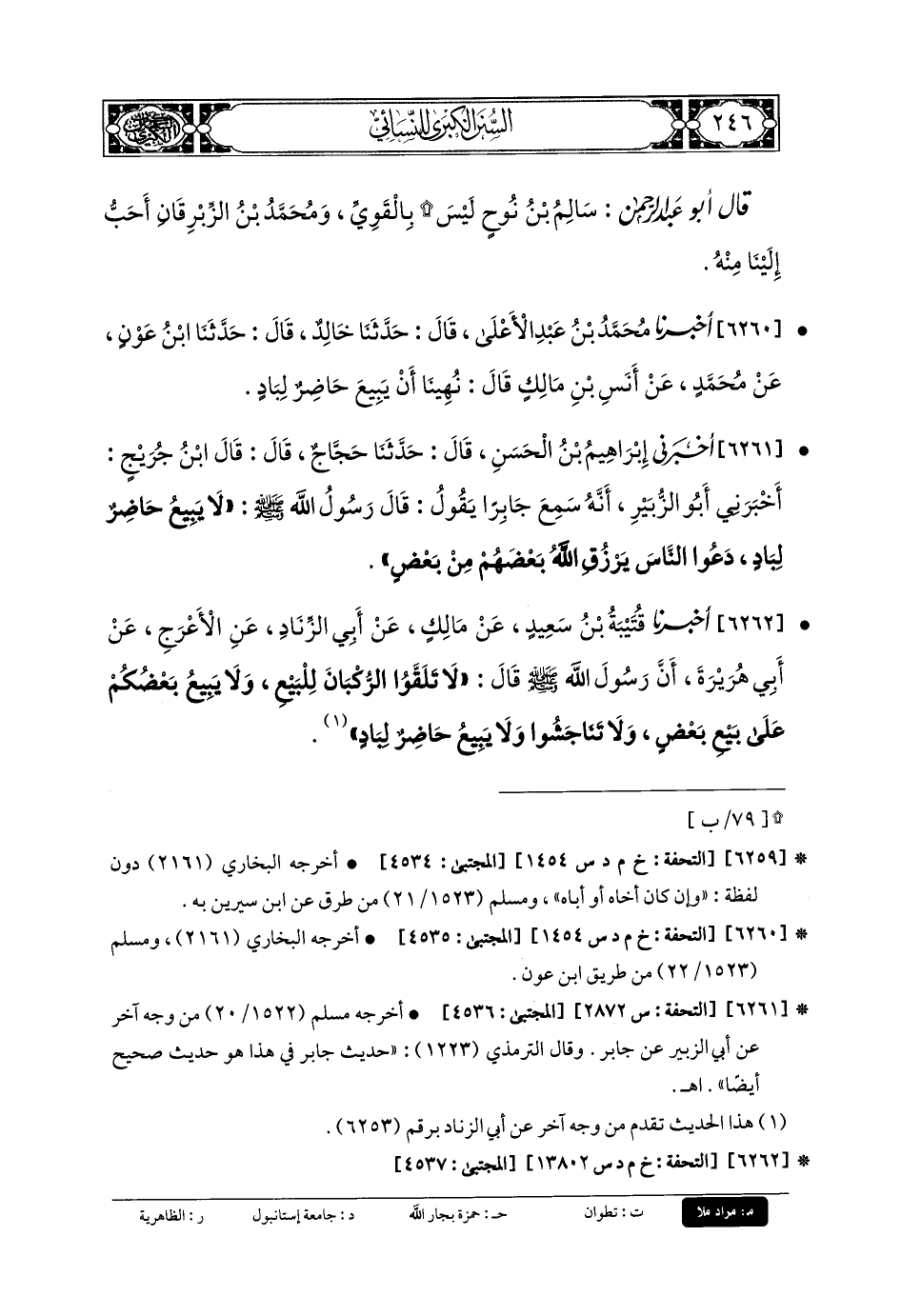 6262- أَخبَرنا قُتَيبَةُ بنُ سَعِيدٍ، عَن مَالِكٍ، عَن أَبي الزِّنَادِ، عَنِ الأَعْرَجِ، عَن أَبي هُرَيرَةَ، أَنَّ رَسُولَ اللهِ صَلى الله عَليه وسَلم قَالَ: لا تَلَقَّوُا الرُّكْبَانَ لِلْبَيْعِ، وَلا يَبِيعُ بَعْضُكُمْ عَلَى بَيْعِ بَعْضٍ، وَلا تَنَاجَشُوا، وَلا يَبِيعُ حَاضِرٌ لِبَادٍ.