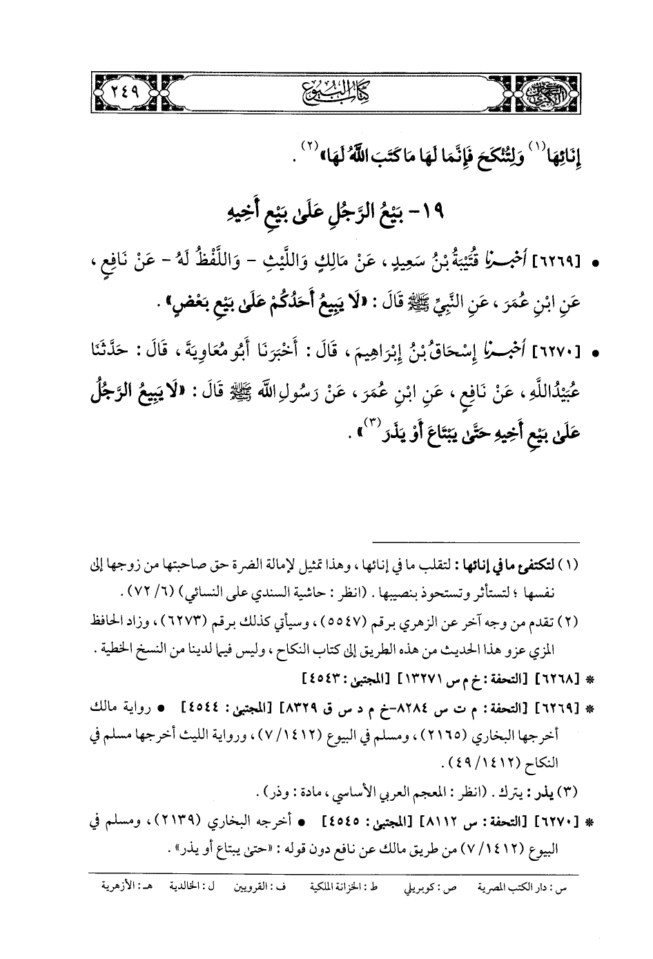6269- أَخبَرنا قُتَيبَةُ بنُ سَعِيدٍ، عَن مَالِكٍ، وَاللَّيْثِ، وَاللَّفْظُ لَهُ، عَن نَافِعٍ، عَنِ ابنِ عُمَرَ، عَنِ النَّبيِّ صَلى الله عَليه وسَلم قَالَ: لا يَبِيعُ أَحَدُكُمْ عَلَى بَيْعِ بَعْضٍ.